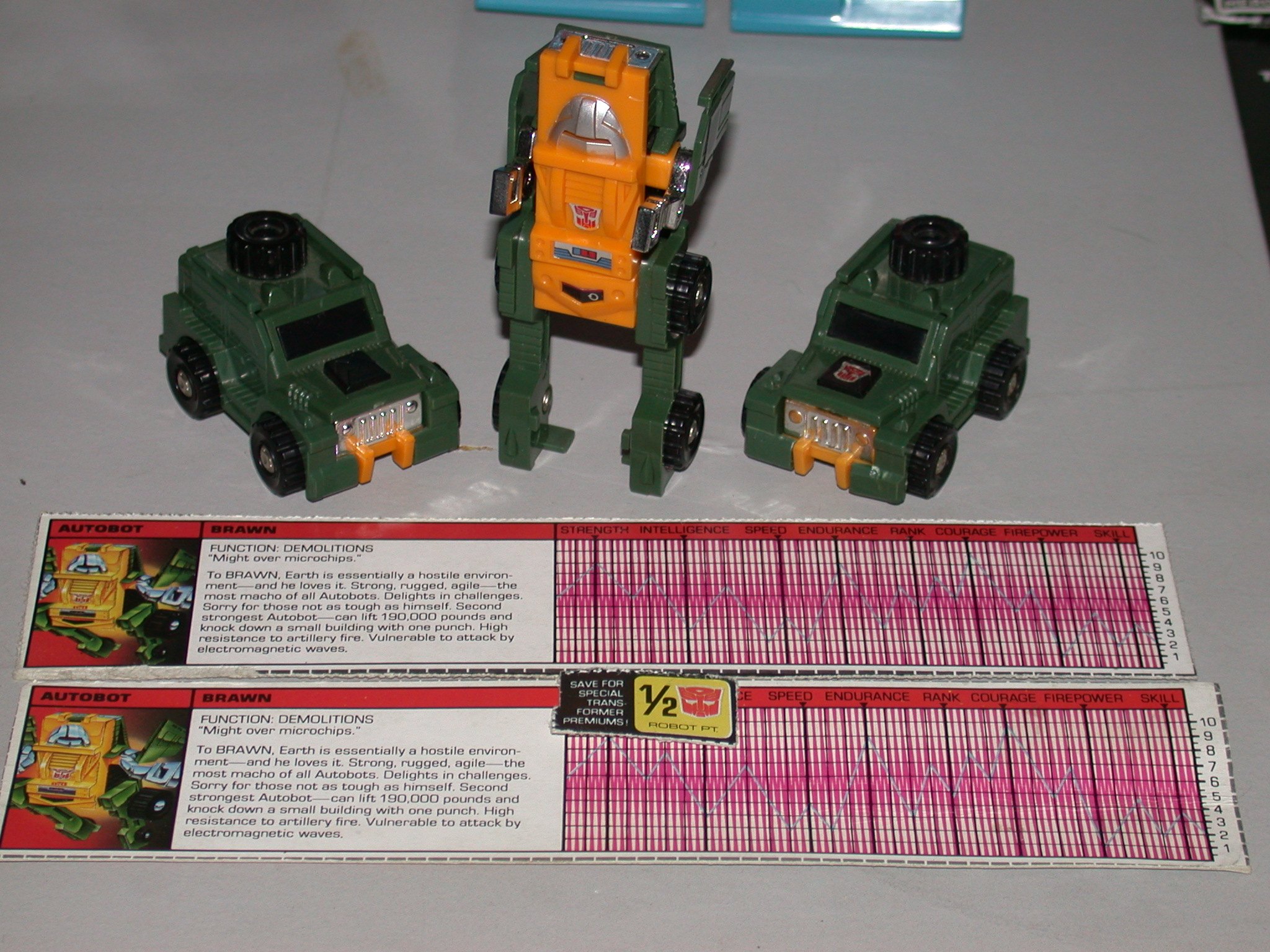 **As you can see, there are no shortages of Brawn's in my collection. I got my first as a kid (He and Bumblebee were my first two Transformers I got), and as well as I tried to take care of my toys, unfortunately, I broke his arm right after I got him. I think most people will agree with me, that They were weak though. Anyway, I made it a mission to get a good one when I could, and wound up with two more. As you can see, I also have two tech-specs for him, as well as the old robot points.**