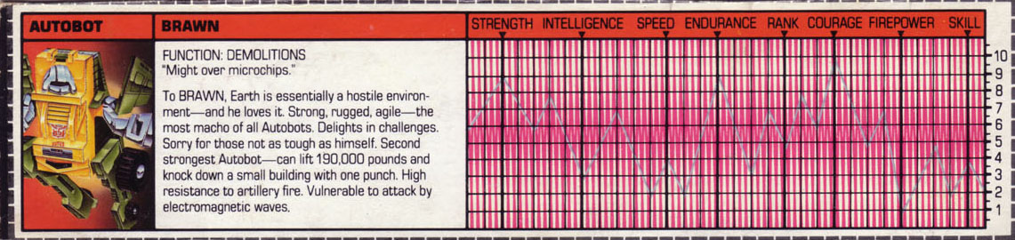 Profile: Brawn looks on Earth as essentially a hostile environment - and he loves it. He is the most macho of the Autobots. He delights in challenges and when he faces one he becomes fully alive. He is strong, rugged and very agile - which is why he is frequently teamed with Bumblebee when the Autobots are in a mountainous environment - but it is his enjoyment of the challenge that makes him valuable to his leader, Optimus Prime. He won't be discouraged and that helps the morale of the rest. He is hardy and enjoys a good joke, if it is not too subtle. His main fault is that he tends to be contemptuous of those not as tough as he.