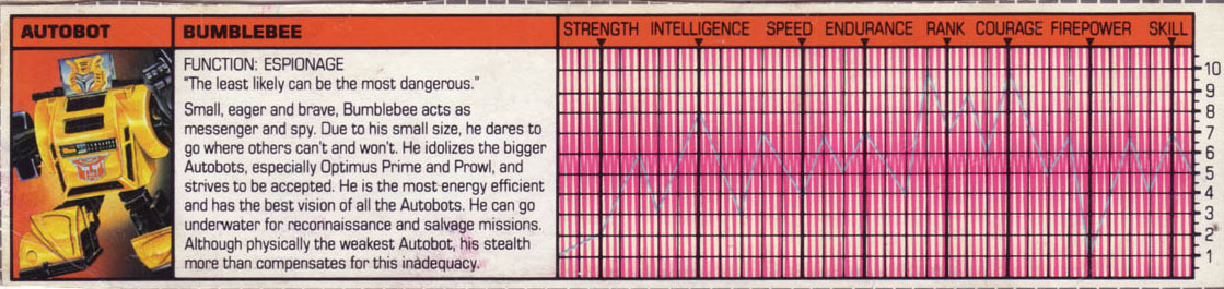 Small, eager, and brave, Bumblebee acts as a messenger and spy. Due to his small size, he dares to go where others can't and won't. He idolizes the bigger Autobots, especially Optimus Prime and Prowl, and strives to be accepted. He is the most energy efficient and has the best vision of all the Autobots. He can go underwater for reconnaissance and salvage missions. Although physically the weakest Autobot, his stealth more than compensates for this inadequacy.