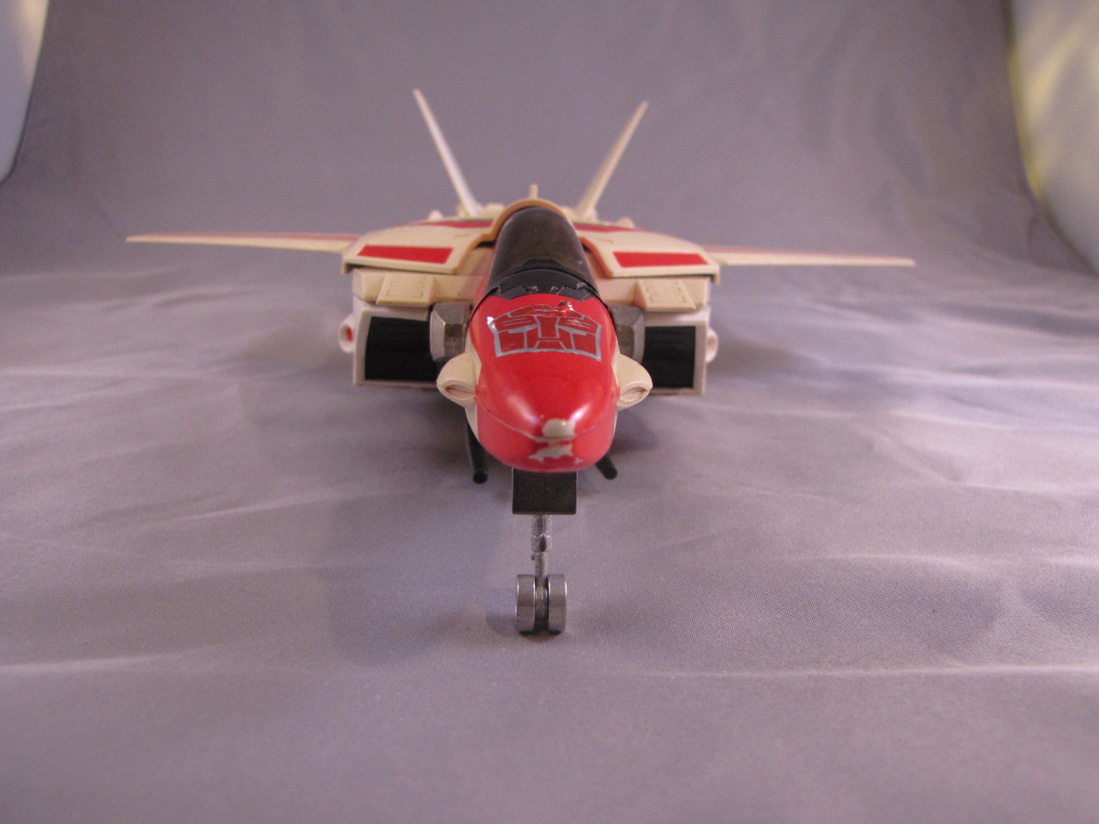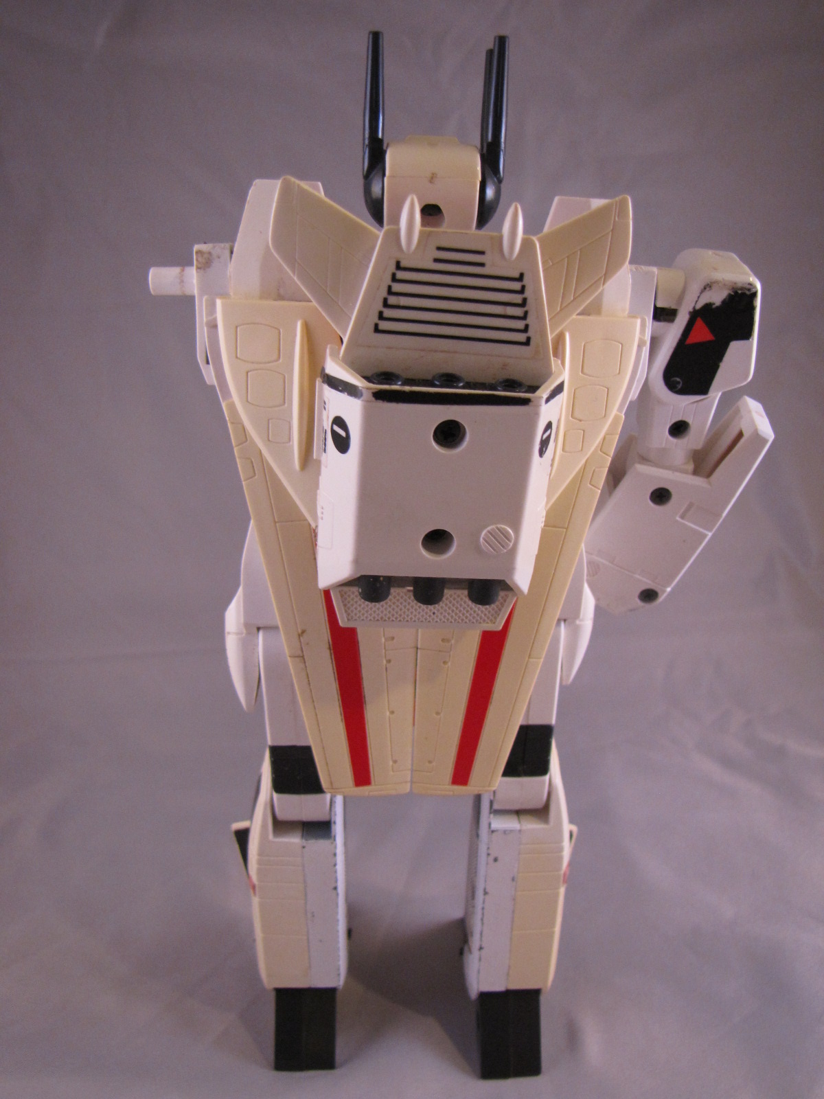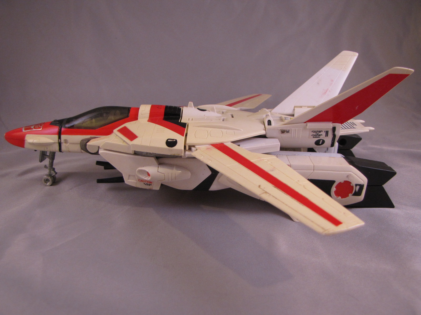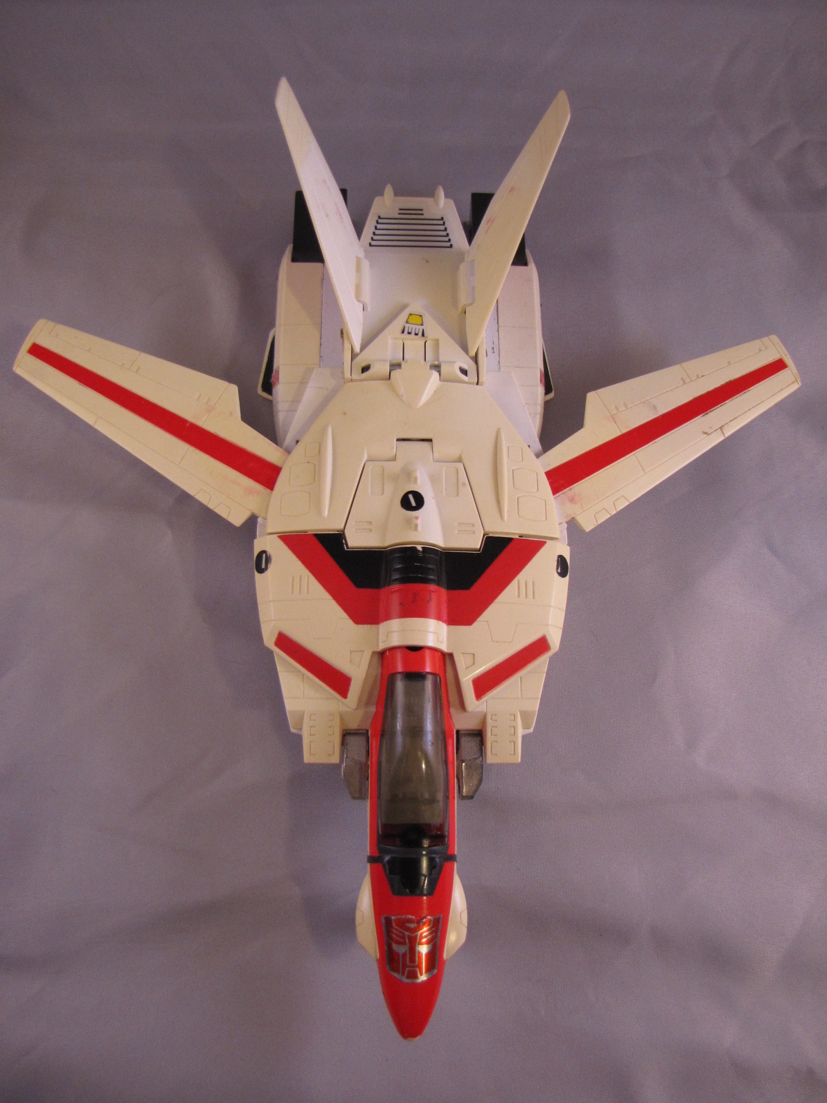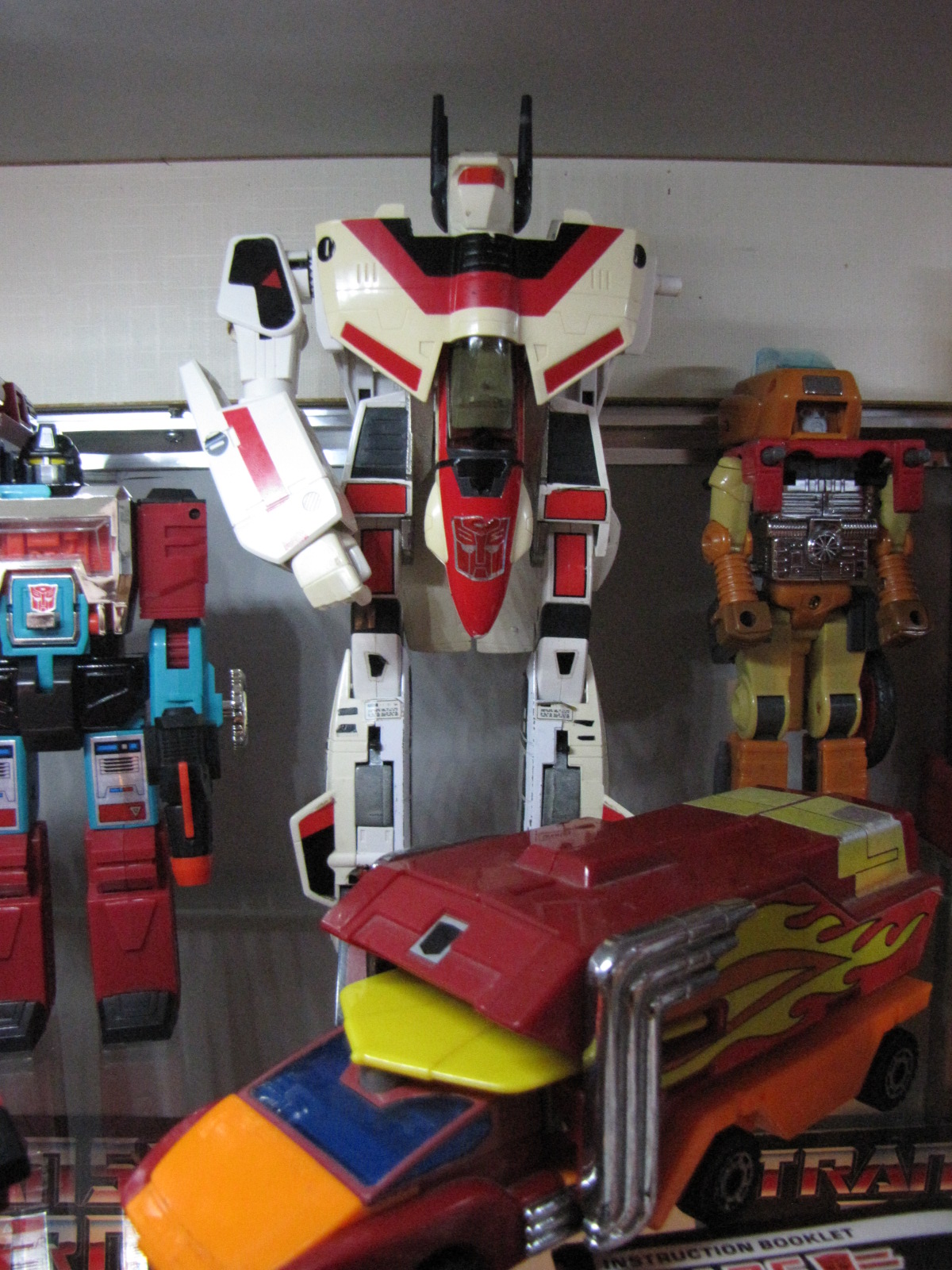 Since I posted the image below and the message above, I have made substantial improvements to my Jetfire collection. Starting with the original one in the photos, I got a replacement arm from a seller I found, and he is good now besides yellowing/missing pieces/etc. In June 2015, I found a great deal on a nice, clean and complete one from one of the Facebook group sellers. Its cool now as I have two of them, one to display in bot mode, and one to display in jet mode. I haven't gotten pictures to put up yet, but will as soon as possible.**