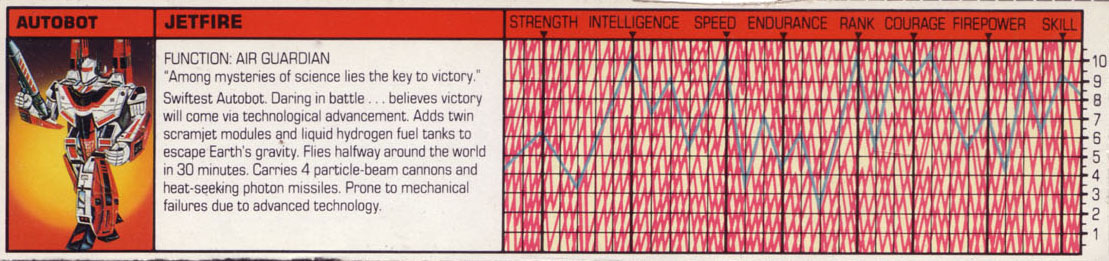 Profile: With a reckless daring that comes from being the swiftest of all the Autobots, Jetfire is the most eager of his comrades to plunge into battle. But his bravado is tempered by one overriding thought: he sincerely believes that victory over the Decepticons can only come through advancements in Autobot technology. As the first of a new generation of Autobots such a credo is perhaps only natural. Also, because he was created on Earth, Jetfire is one of the few Autobots who has no memory of his home planet. His allegiance to his cause is only matched by his devotion to scientific research.