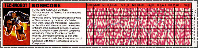 Abilities: In vehicle mode, Nosecone's most distinctive feature is also his most formidable asset: his durabyllium-steel alloy drill can pierce almost any material, and it is virtually indestructible. He also packs two rocket-propelled missiles that use a videocom tracking system to lock on to targets. He's slow of speed, but his treads can carry him across any terrain and up the steepest slopes. In robot mode, he is armed with a high-powered X-ray laser pistol. He combines with his fellow Technobots to form the super-robot Computron.