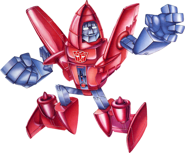 A show off... proud that he's one of few Autobots that can fly. Incredible maneuverability... delights in displaying his dazzling aerial virtuousity, to friends or foes... just wants their appreciation of his talent. Cruises at 500mph... can increase power output and speed to 3200 mph for short periods. Carries small concussion bombs... shoots thermal beam as plane and robot. Gets into more troubles with enemy planes than he can handle. | |||||||