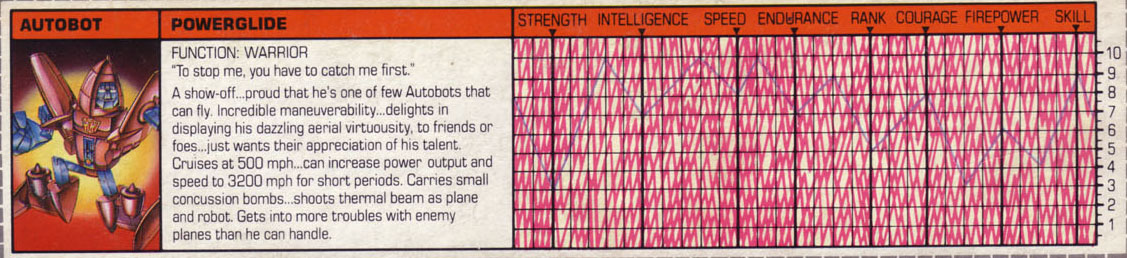 Weaknesses: As a result of the great confidence he has in his flying ability, Powerglide often gets into more trouble than he can handle with enemy jets. He has relatively little strength in robot mode.