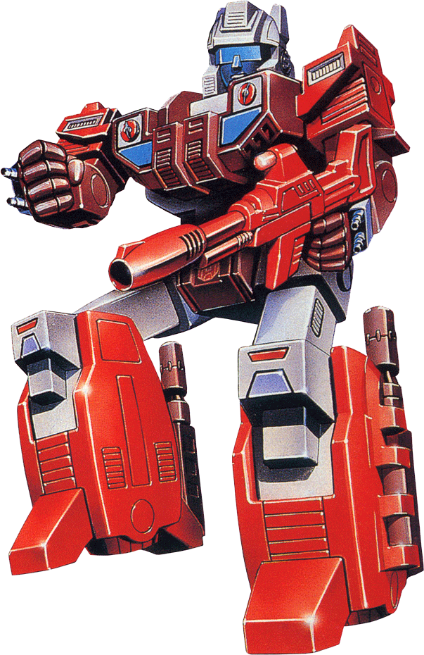 A brawling, bragging beserker... he wades into a Decepticon patrol with all barrels blazing, doesn't stop until he's out of ammo.  Calls those who disapprove of his methods "tinplated bucketheads."  Rude, gruff and direct.  In vehicle and battle station modes, has electric pulse cannon in nosecone; array of sonic, thermal and artillery shell guns.  In robot mode, has 500 rounds-per-minute automatic acid-pellet gun.  Combines with fellow Technobots to form Computron.