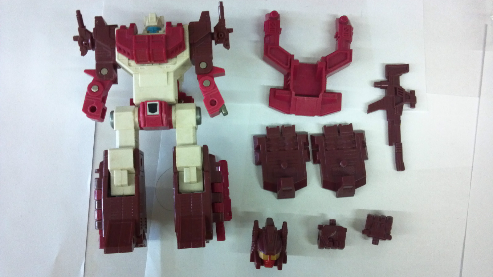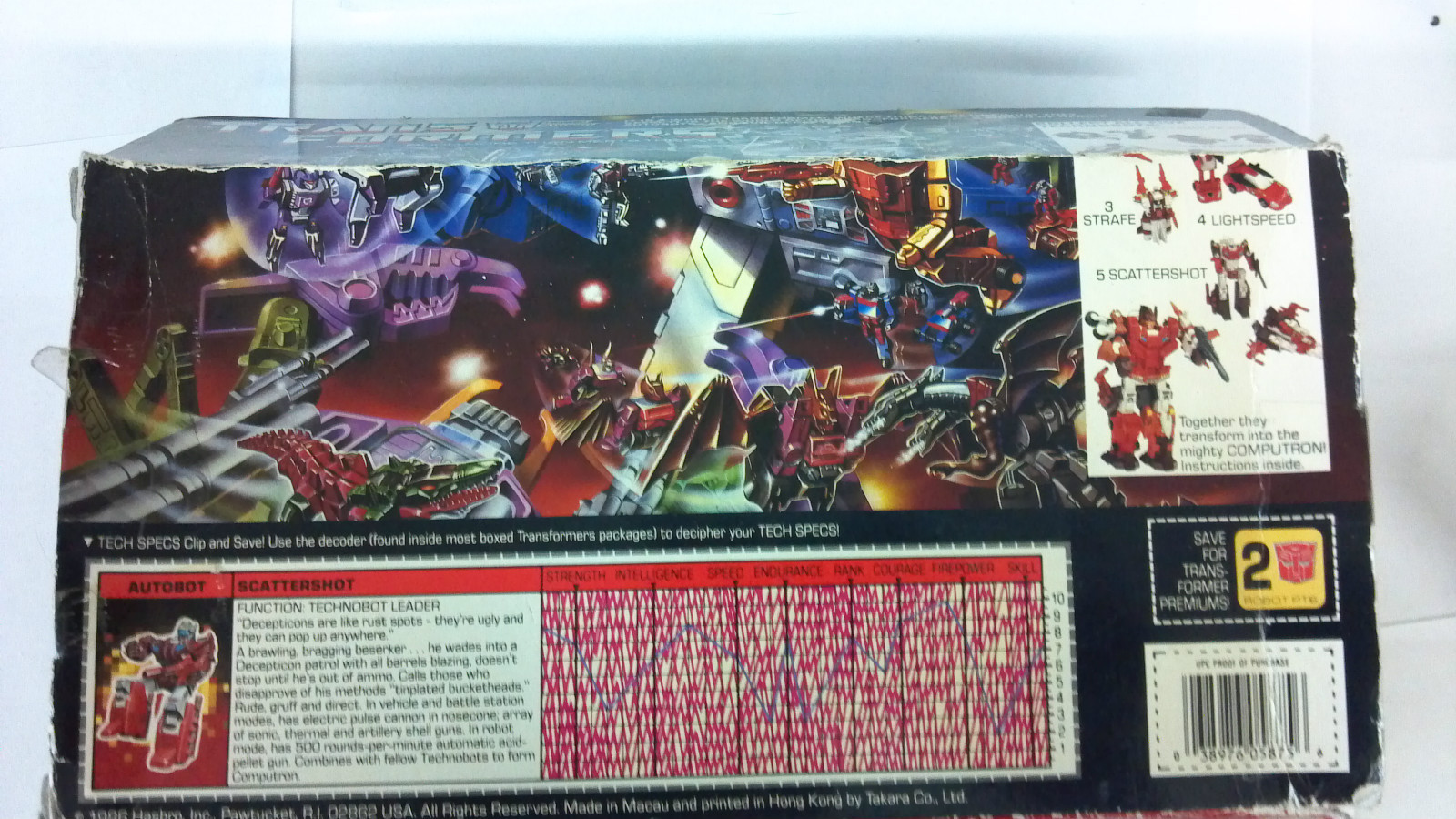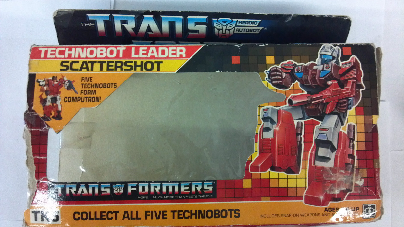 **Scattershot is a eBay purchase from May 2012. He is in good physical shape as far as the structure itself, but is missing a lot of stickers. He is complete with his box (not in good shape) as well as his weapons, the Acid-Pellet Gun, two Artillery Guns, Computron Chest Shield, the two Foot Stands, the two Fists, and Computrons Head. Updated pictures soon.**