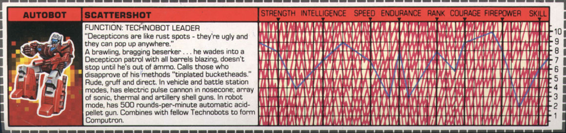 Profile: Scattershot leads by his actions, not his words. This brawling, bragging berserker's idea of strategy is to wade into a Decepticon patrol with all barrels blazing and not withdraw until he's out of ammo or out of enemies, whichever comes first. And he expects his followers to do the same. Anyone who disapproves of his tactics he considers a "tin-plated buckethead." At times, given his rude, gruff manner, Scattershot seems more like a caricature of a career soldier than a real one. But this blustery, often comical demeanor can't disguise the valiant warrior underneath - one who will shed his last drop of fuel, if necessary, for the Autobot cause.