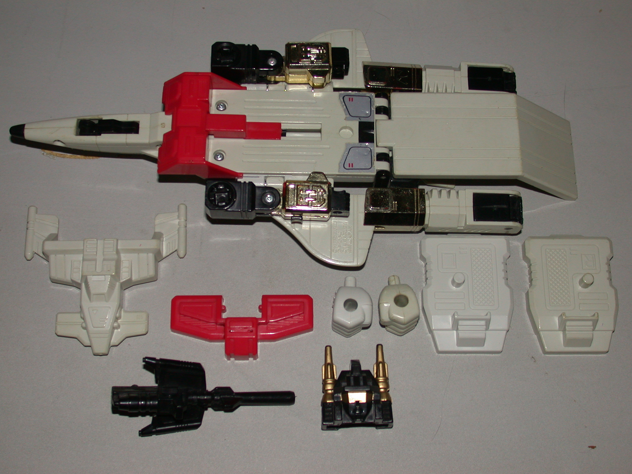 **Silverbolt is one of the guys I got in a trade as a kid. For more of the story, check out Superion and Optimus Prime. Silverbolt is in good condition with fairly tight joints and minor sticker wear. I really liked this guy as a kid, because not only was the biggest of the Aerialbots, and their leader, but loved hooking the ramp up to him and making him a base. See the bottom pictures for his base mode. He comes almost complete with his instructions, his gun, which is the Electrostatic Discharger Rifle, Superions Blast shield, the Blast Deflector, the Superion Head, both Superion Fist, both Superion Feet, and the ramp. I am just missing his Tech Specs. Needs a little cleaning.**