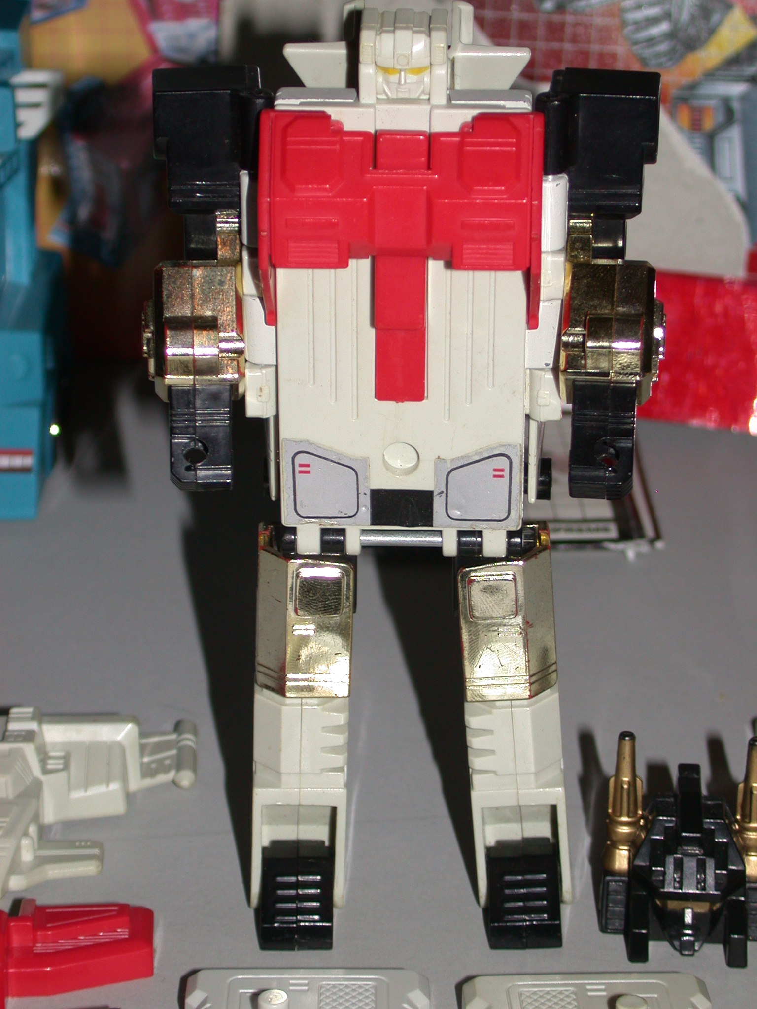 Scared of heights. Brave, grimly determined warrior, but he struggles to maintain that image in order to hide his phobia. Selected by Optimus Prime to command so he'd be too busy worrying about others to worry about himself. In jet mode, speed of Mach 1.9, range 4500 miles. Carries electrostatic battery that releases electric bolt of up to 150,000 volts through his nose cone. Uses electrostatic discharger rifle in robot mode. Combines with other Aerialbots to form "Superion". | |||||||