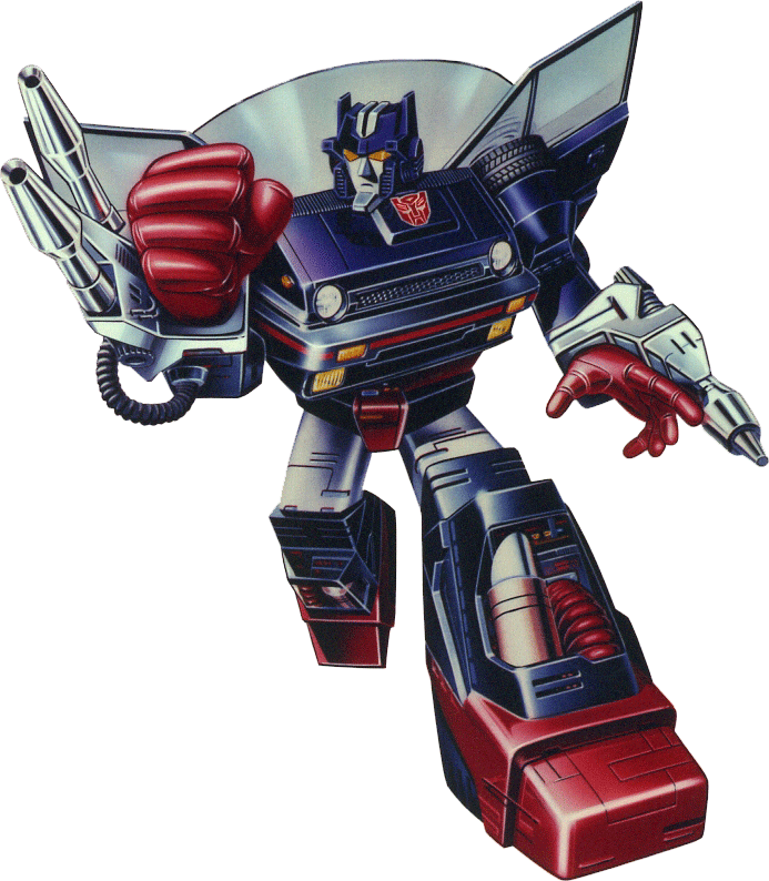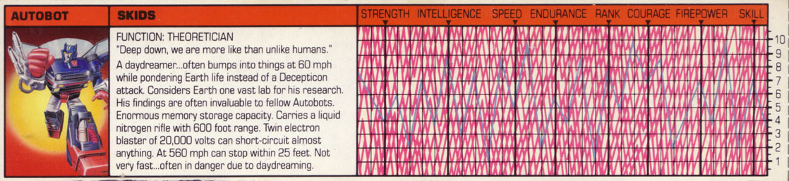 A daydreamer... often bumps into things at 60 mph while pondering Earth life instead of a Decepticon attack. Considers Earth one vast lab for his research. His findings are often invaluable to fellow Autobots. Enormous memory storage capacity. Carries a liquid nitrogen rifle with 600 foot range. Twin electron blaster of 20,000 volts can short-circuit almost anything. At 60 mph can stop within 25 feet. Not very fast... often in danger due to daydreaming.
