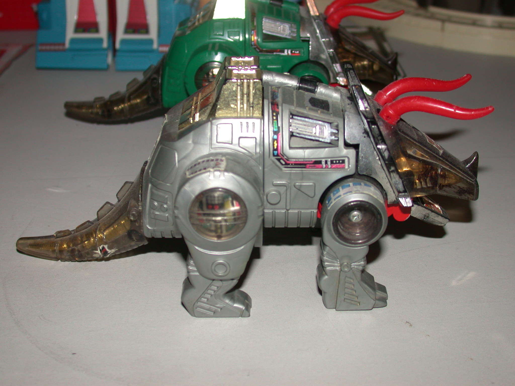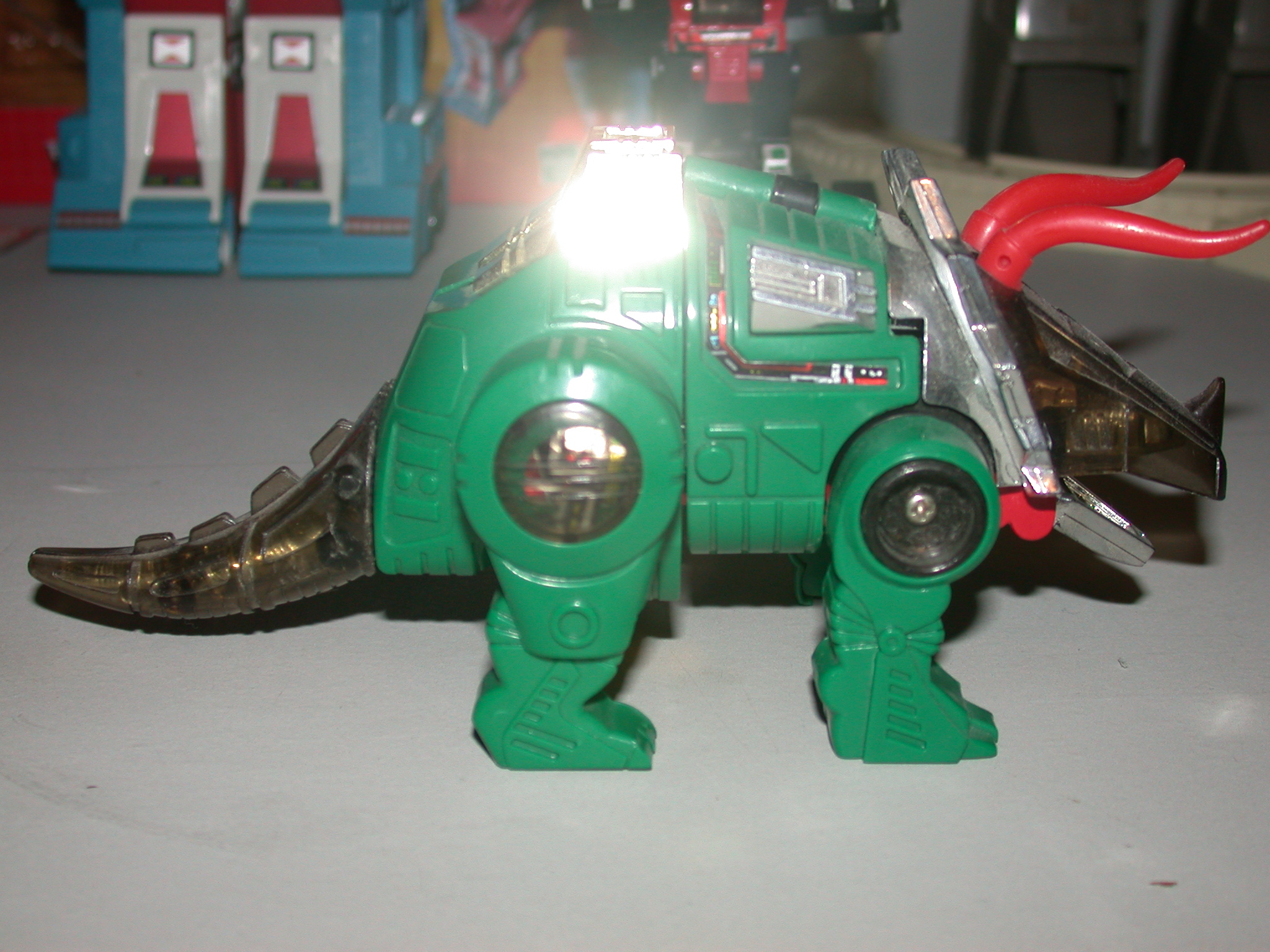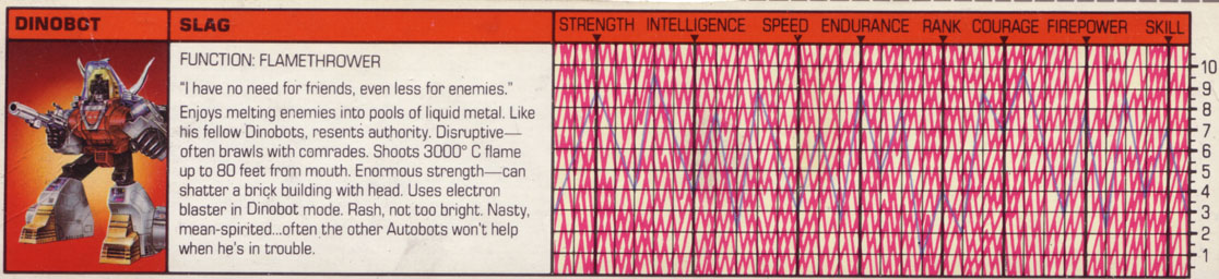 Abilities: In Dinobot mode, Slag can spew from his mouth a bolt of 3,000 degrees Centigrade flame up to 80 feet. He possesses enormous strength and can shatter a brick building with a single blow from his armored head. In Autobot mode he carries a high-energy laser rifle.