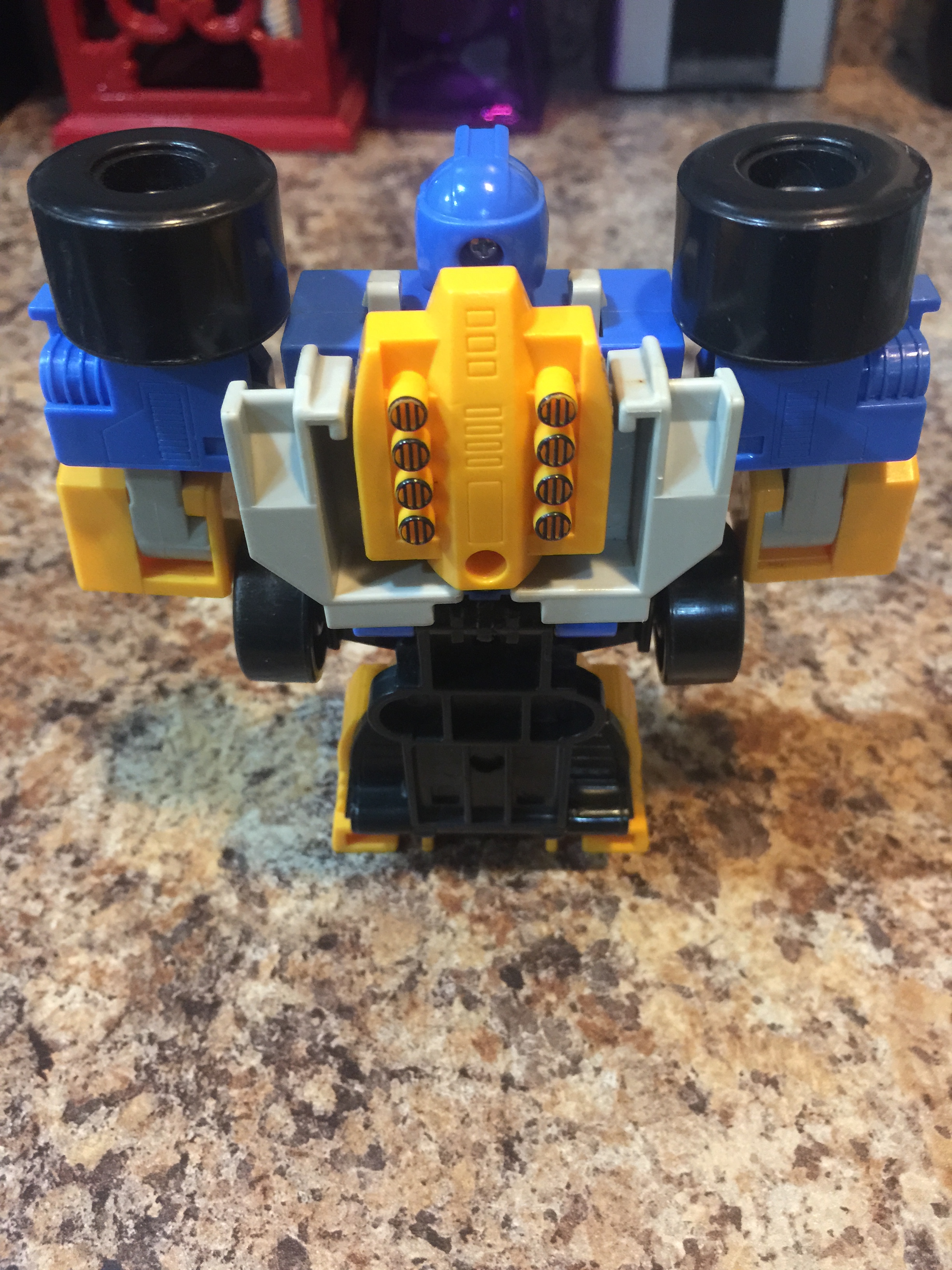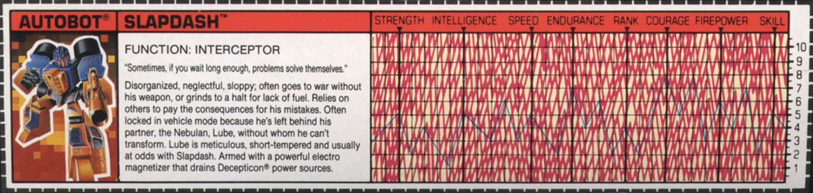 Abilities: Slapdash transforms into a ground racing vehicle. In this mode he can reach a maximum speed of 600 miles per hour and has a maximum range of 1800 miles... when he remembers to fill up his tank. In both robot and vehicle modes he is armed with a powerful electro-magnetizer gun, which has the ability to neutralize and drain the power supply of almost any machine its beam hits. He reserves its usage almost exclusively for enemy Decepticons. Lube has the ability to transform into Slapdash's engine. In this mode he acts as Slapdash's power source and can process almost any fuel source into usable form.