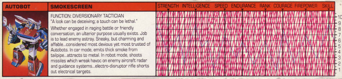 Profile: Whether engaged in raging battle or friendly conversation, seldom is Smokescreen up to what he appears to be up to. More likely, an ulterior purpose exists. In combat, his job is to lead the enemy astray, to prevent him from discovering the true nature of an Autobot strategy until it is too late for the enemy to counter it. It is a job he performs with great proficiency. His duplicity carries over to his personal affairs as well. Charming and affable, it is easy for Smokescreen to use his genuine camaraderie with his fellow Autobots in order to root out their deepest concerns. And, at Optimus Prime's request, that is exactly what Smokescreen does, because Optimus feels that his role as Autobot leader creates a personal barrier between himself and his followers that he cannot overcome alone. Strangely enough, in Optimus' eyes, the most devious of the Autobots is also the most trusted.