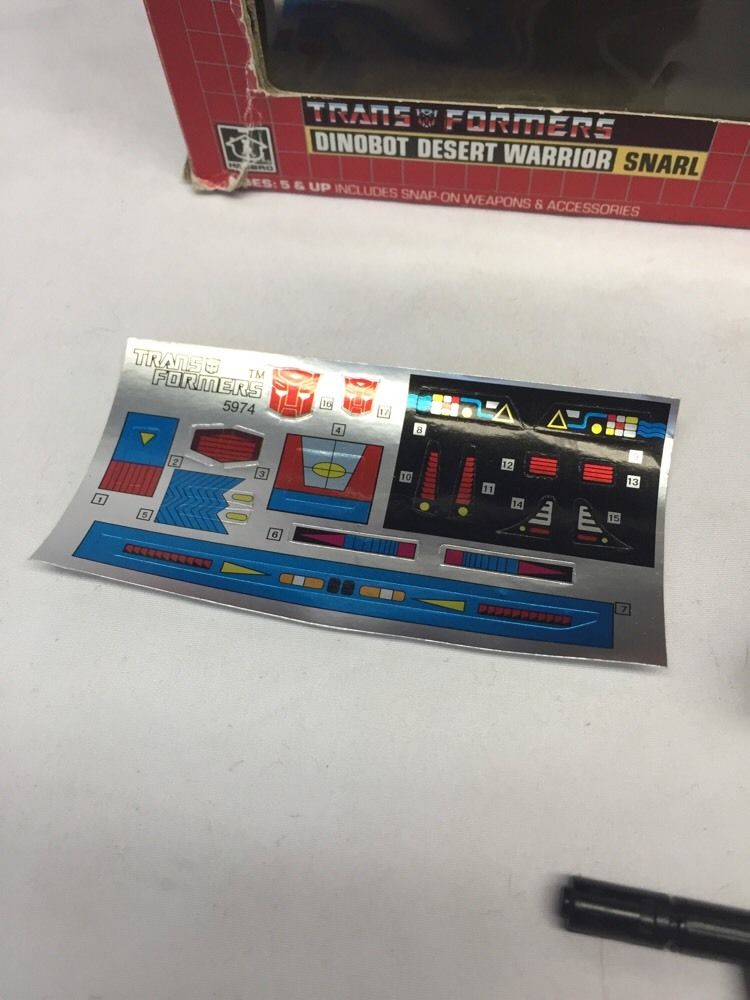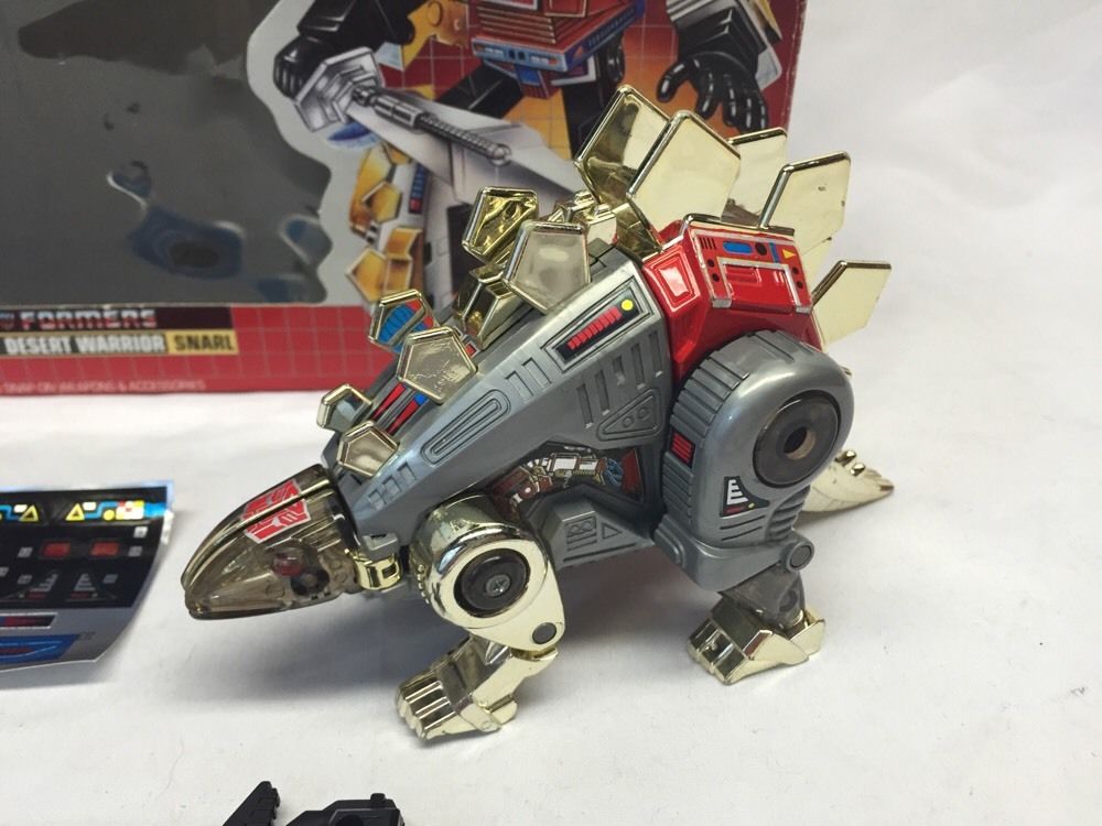 **I got Snarl in August 2015 on a good deal eBay purchase. The Dinobots have been late to my collection mostly due to their popularity, therefore expensive cost of purchase. I just have decided to keep my eyes open for that rare deal, and this purchase of Snarl is one such deal. He wasn't complete as of time of purchase, but came with his box, unused sticker sheet, Electron cannon and rocket pod. He was missing his three rockets and Energo Sword. He is in very great cosmetic condition though he does have loose pieces. As my Dinobots go, he is in the best condition of any I own as of his purchase date.