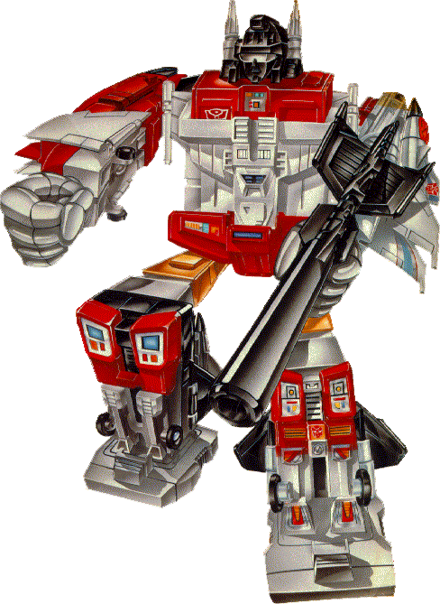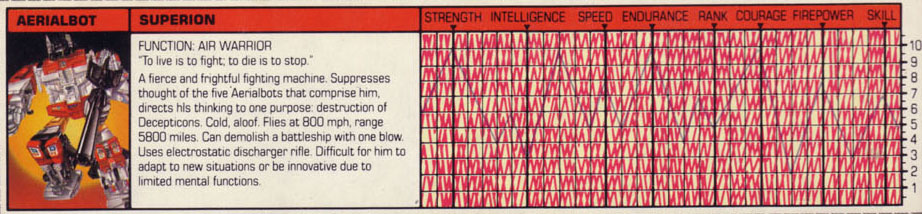 A fierce and frightful fighting machine. Suppresses thought of the five Aerialbots that comprise him, directs his thinking to one purpose: destruction of Decepticons. Cold, aloof. Flies at 800 mph, range 5800 miles. Can demolish a battleship with one blow. Uses electrostatic discharger rifle. Difficult for him to adapt to new situations or be innovative due to limited mental functions.