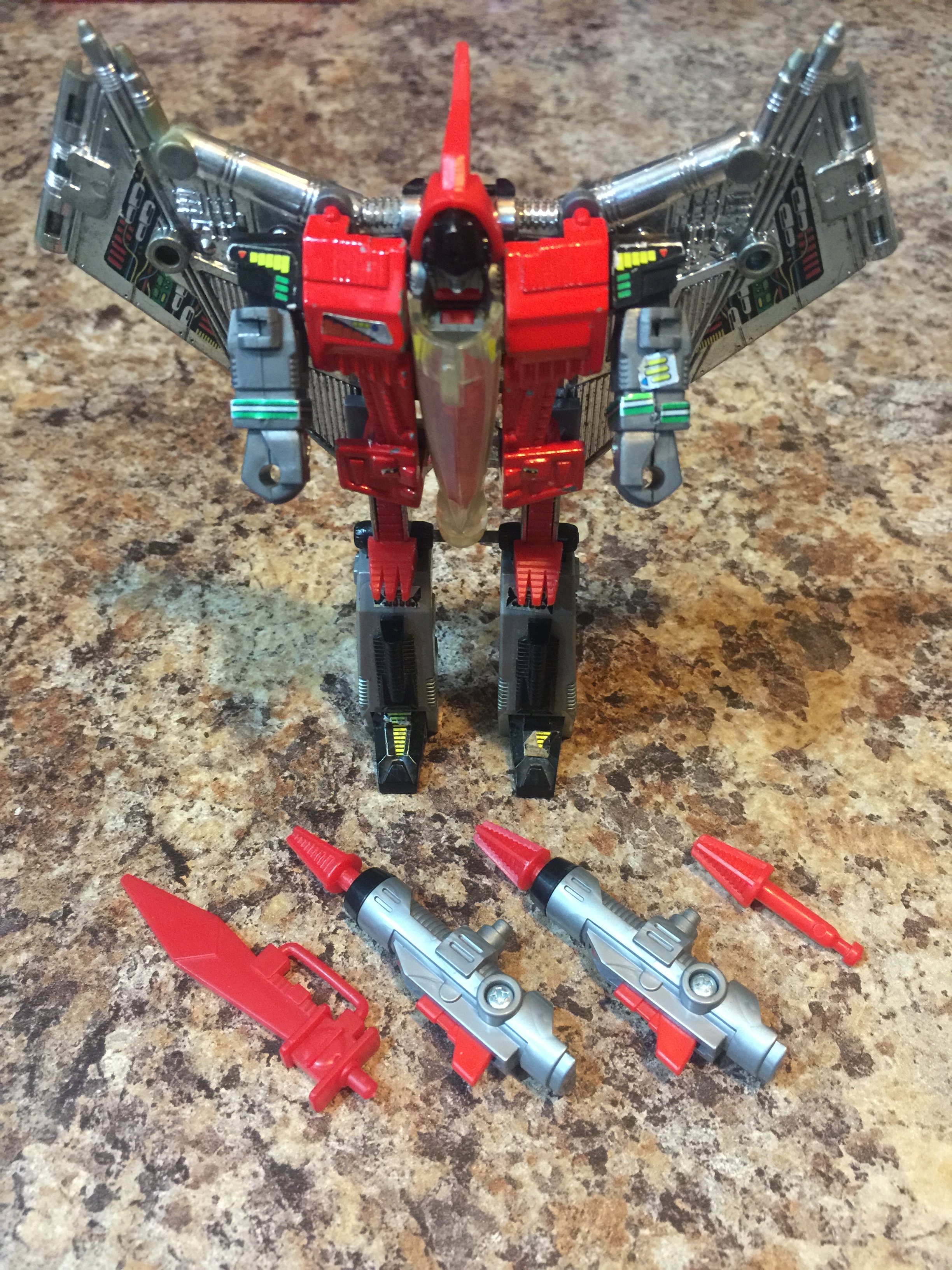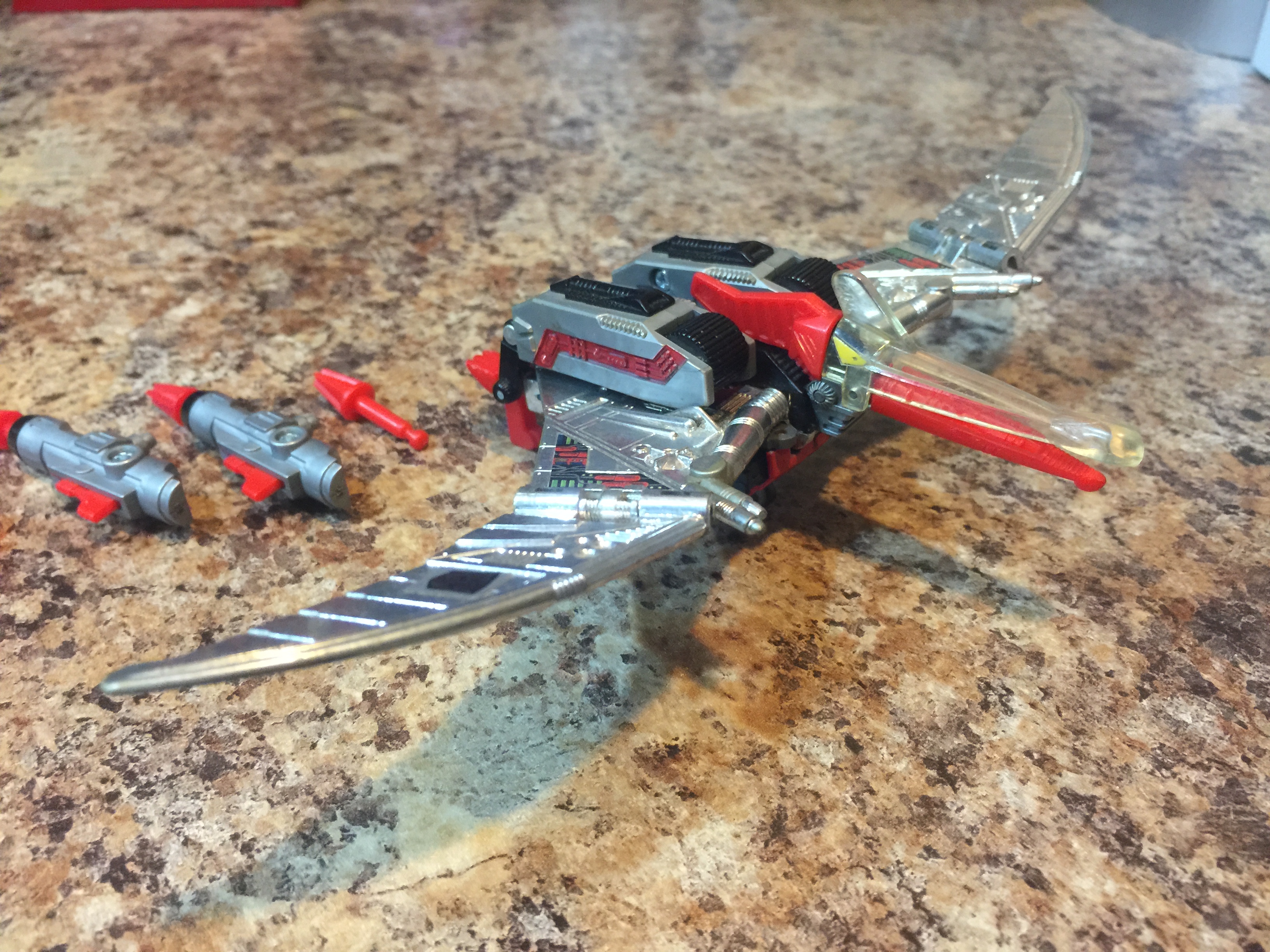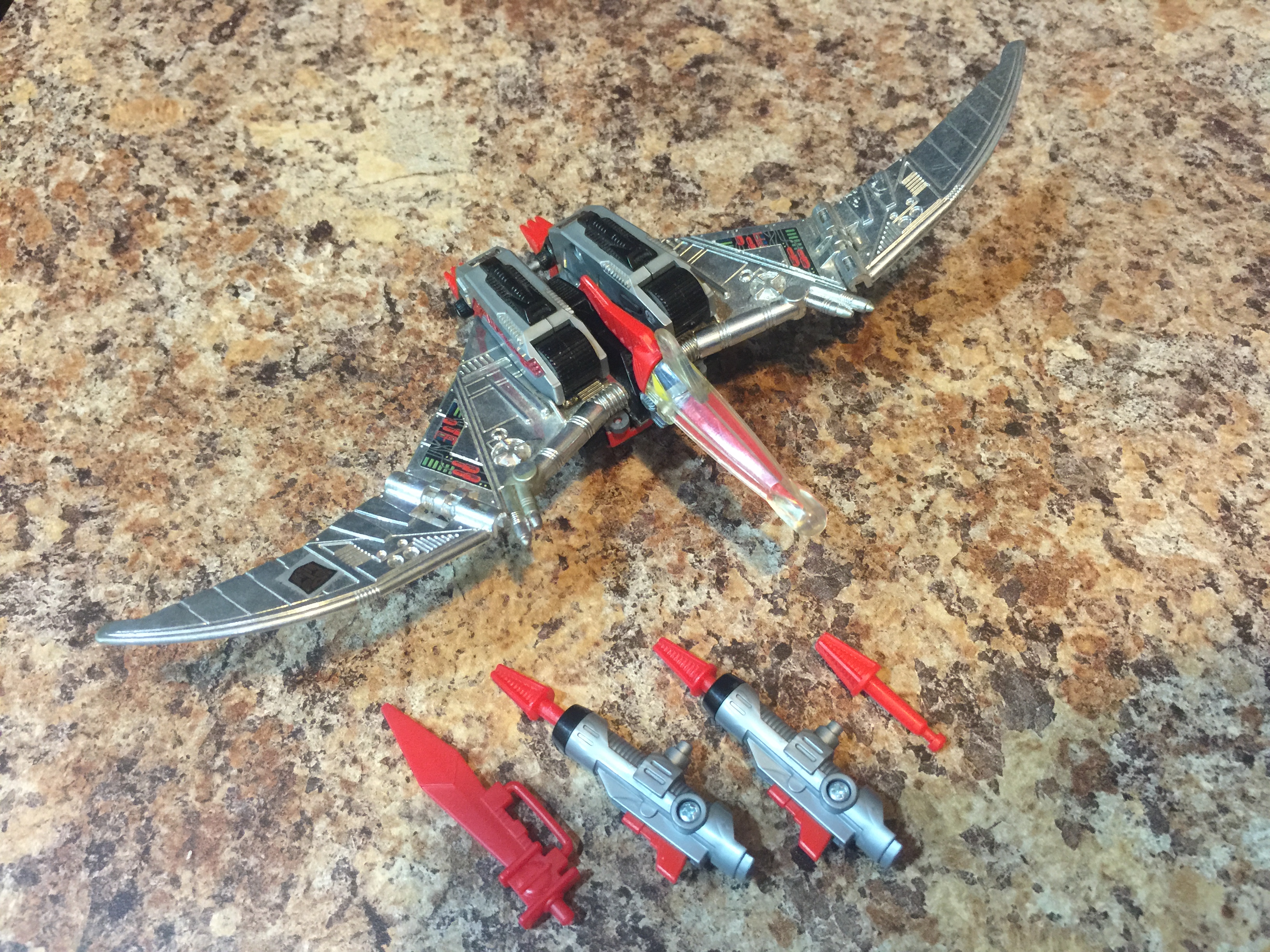 **I got Swoop in October 2015 on a good deal from a local seller I met on eBay.  The Dinobots have been late to my collection mostly due to their popularity, therefore expensive cost of purchase.  I just have decided to keep my eyes open for that rare deal, and this purchase of Swoop is one such deal.  He is complete as of time of purchase and came with his Electron cannon and rocket pod.  He is in very great cosmetic condition though he does have loose pieces.