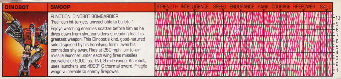 Enjoys watching enemies scatter before him as he dives down from the sky... considers spreading fear his greatest weapon. This Dinobot's kind, good-natured side disguised by his horrifing form... even his comrades shy away. Flies at 250mph... air-to-air missile launcher under each wing fires missiles equivalent of 5000lbs. TNT, 8 mile range. As robot, uses launchers and 4000 degrees Celcius thermal sword. Fragile wings vulnerable to enemy firepower.