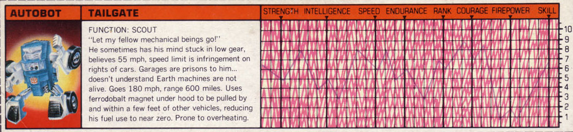 Profile: In the words of Optimus Prime, "Tailgate sometimes has his mind stuck in low gear!" A lot of what Tailgate thinks is just plain screwy. Although he understands Earth traffic laws, he doesn't agree with many of them. For example, he believes the 55 mph speed limit is an infringement upon the personal rights of cars. In fact, all his views on Earth machines are warped. He likens cars locked in garages to imprisonment without a fair trial. He considers the buying and selling of household appliances to be slave trading. Efforts by his fellow Autobots to convince Tailgate that Earth machines are not alive, and therefore not entitled to the same rights as Transformers, have so far failed. "Only barbarians treat the lesser among them so cruelly," proclaims Tailgate. Unfortunately, the oppressed in this case can never appreciate the efforts of their would-be-savior. Tailgate is not a well robot.