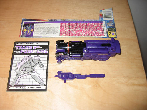 My Astrotrain is complete with his gun, instructions and tech-specs.  He does have some sticker and play wear, but he is in excellent shape otherwise.  Picked him up on eBay in February 2010**