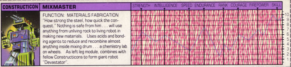 Profile: Nothing is safe from him... he will use anything from unliving rock to living robot in making new materials. Uses acids and bonding agents to reduce and recombine almost anything inside mixing drum... a chemistry lab on wheels. As left leg module, combines with fellow Constructicons to form giant robot Devastator".