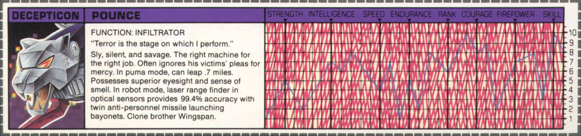 Abilities: In puma mode, Pounce can creep with virtually no noise at all and then leap up to a colossal seven miles to pounce on his unsuspecting prey. He possesses enhanced eyesight (including highly defined night vision) and an enhanced sense of smell. He can track virtually anything, anywhere. In robot mode the laser range finder and target lock system in his optical sensors provide 99.4% accuracy with his twin anti-personnel missile launching guns, both of which come complete with metal shearing bayonet attachments. He is the clone brother of Wingspan.