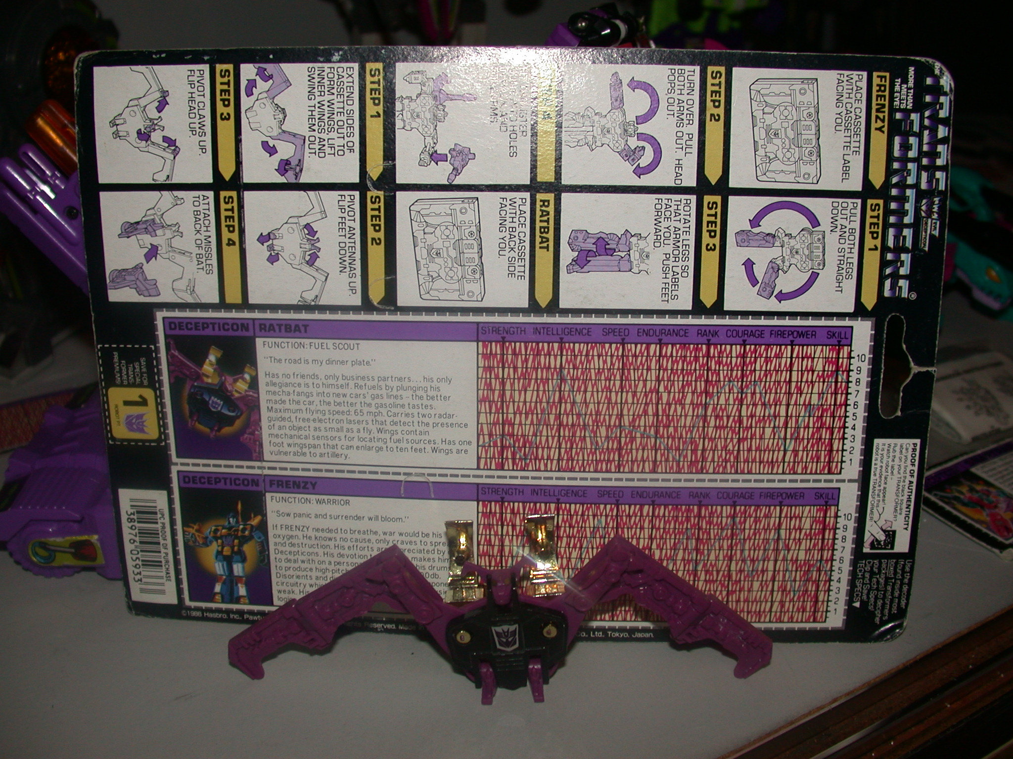 below is Ratbat and frenzy. I have the original complete card with tech specs and the rest. Ratbat is in great condition, and has both of his ears, which is not the case a lot of the time. he also has gold weapons, in near mint condition.