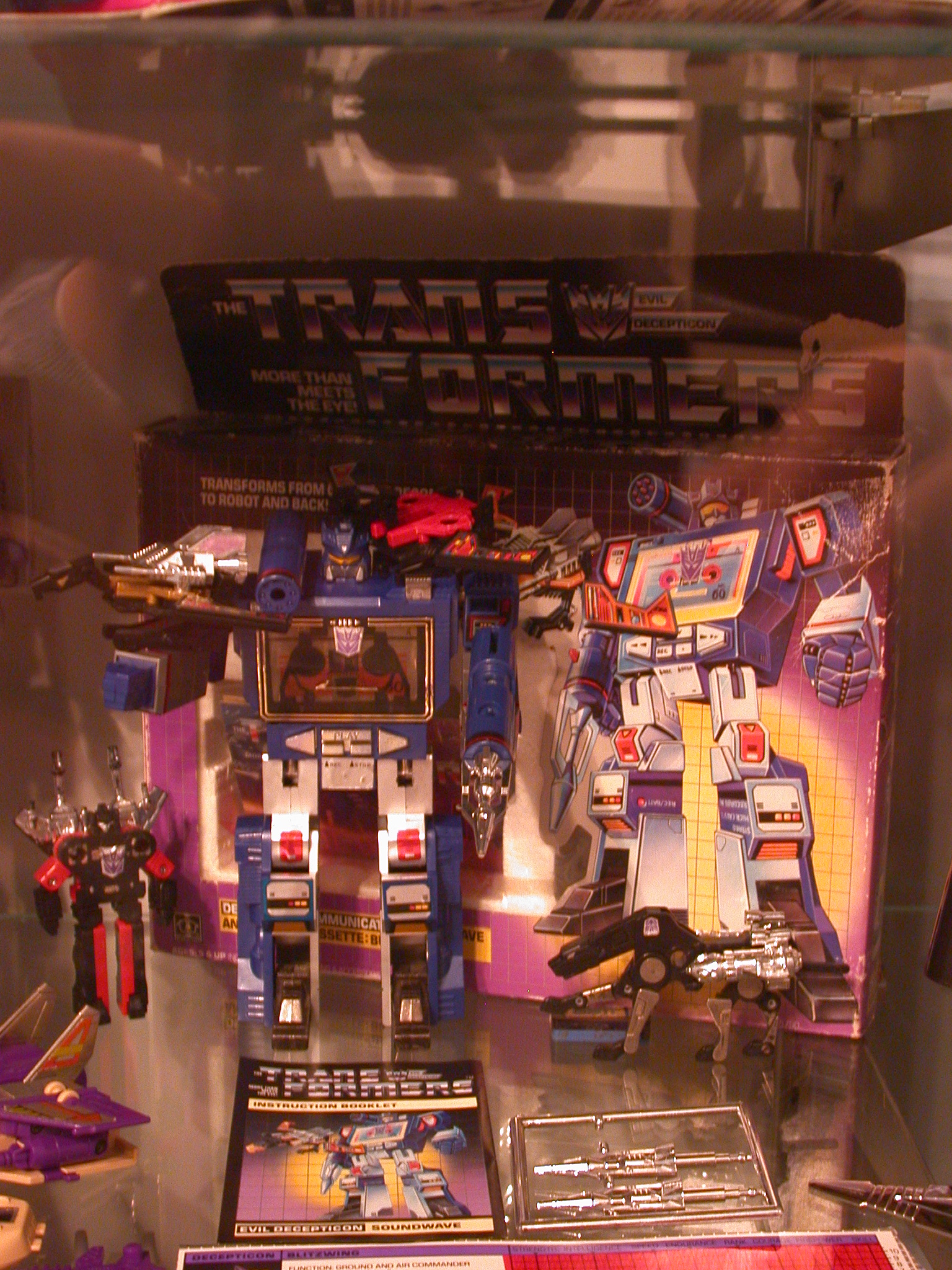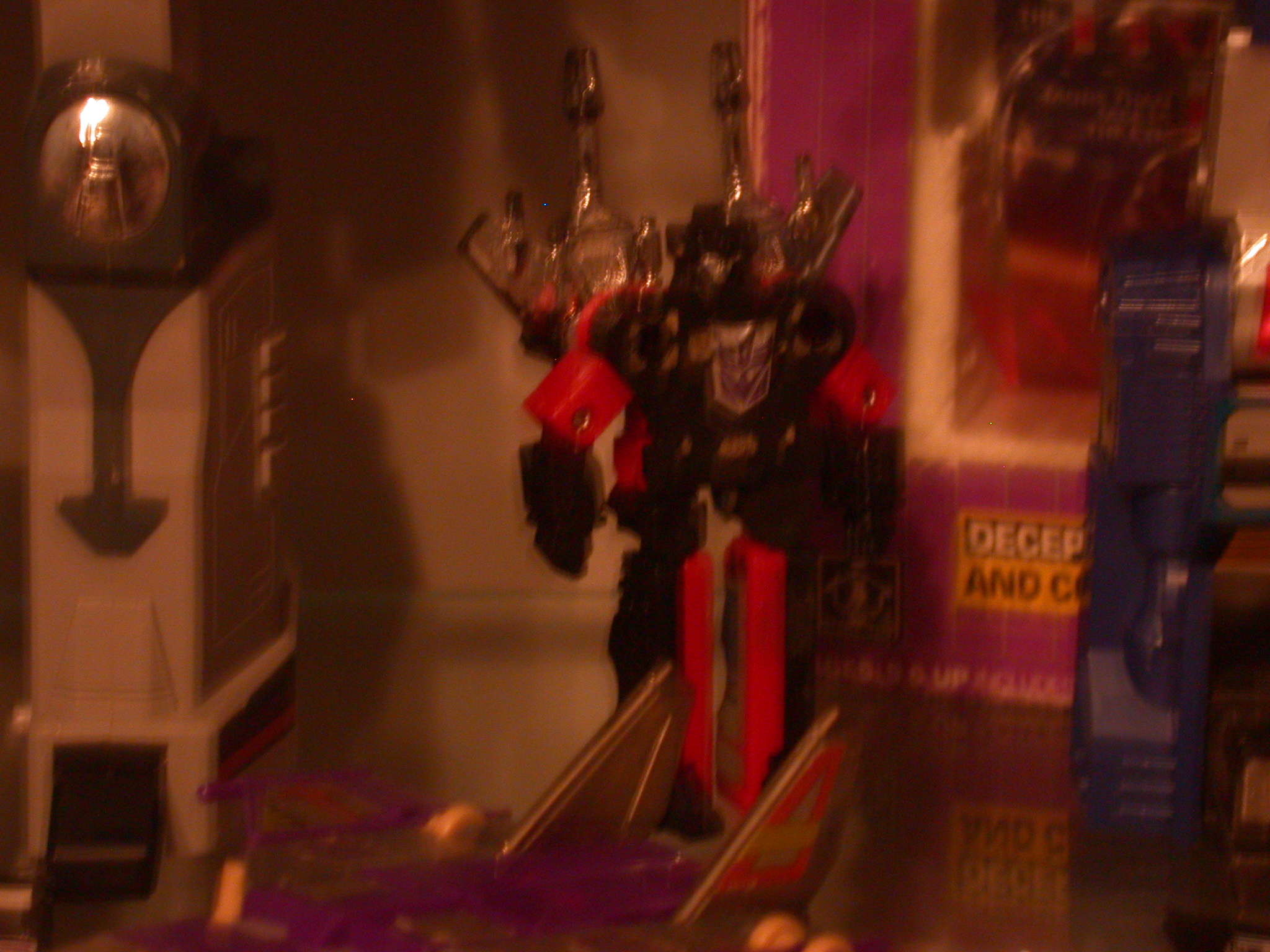 Also is a picture of my personal Soundwave, kind of the crown jewel of my collection, due to him being my one original in almost perfect condition. While not in perfect shape itself, I still have the box and styro-foam in great condition. I have all of his weapons including two of the original missiles still on the tree, and the used sticker sheet. His included Buzzsaw is also perfect.**