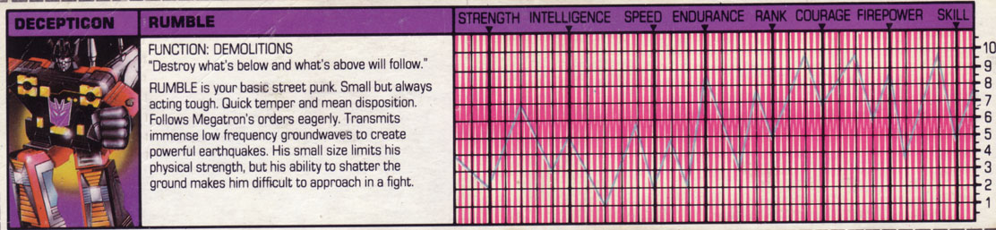 Profile: Rumble is your basic street punk. He compensates for his small size by always acting tough. And he is tough. Cross him and he'll punch your optic sensors out. He has a quick temper and a mean disposition. The other Decepticons try to keep their distance. Yet, this unpleasant, swaggering little hoodlum is one of Megatron's favorites. Rumble follows orders blindly and hungrily; he always waits impatiently for Megatron's next assignment. A good time for Rumble is shaking a building into a heap of rubble. "I love the sight of crumbling bricks," he says.