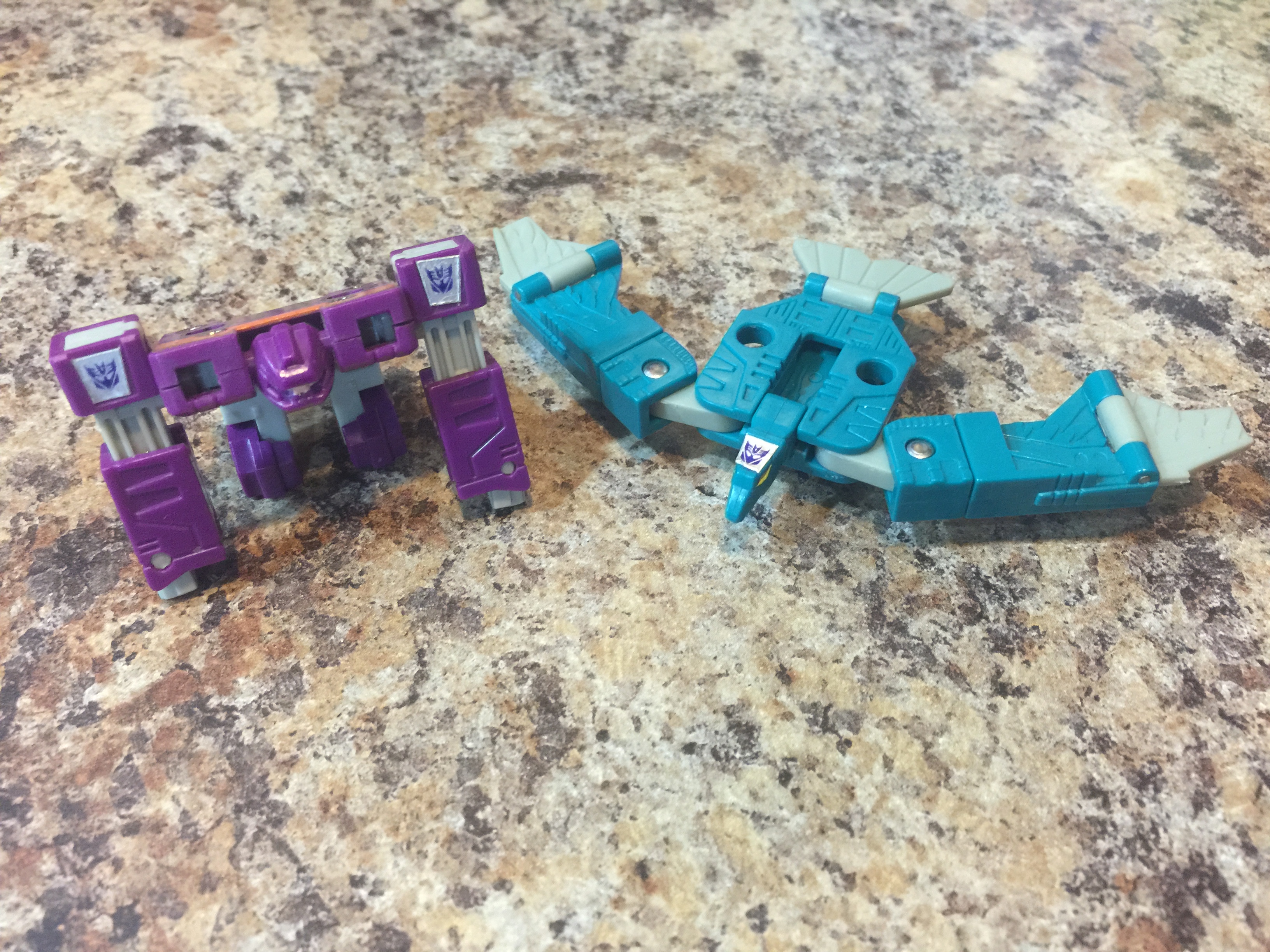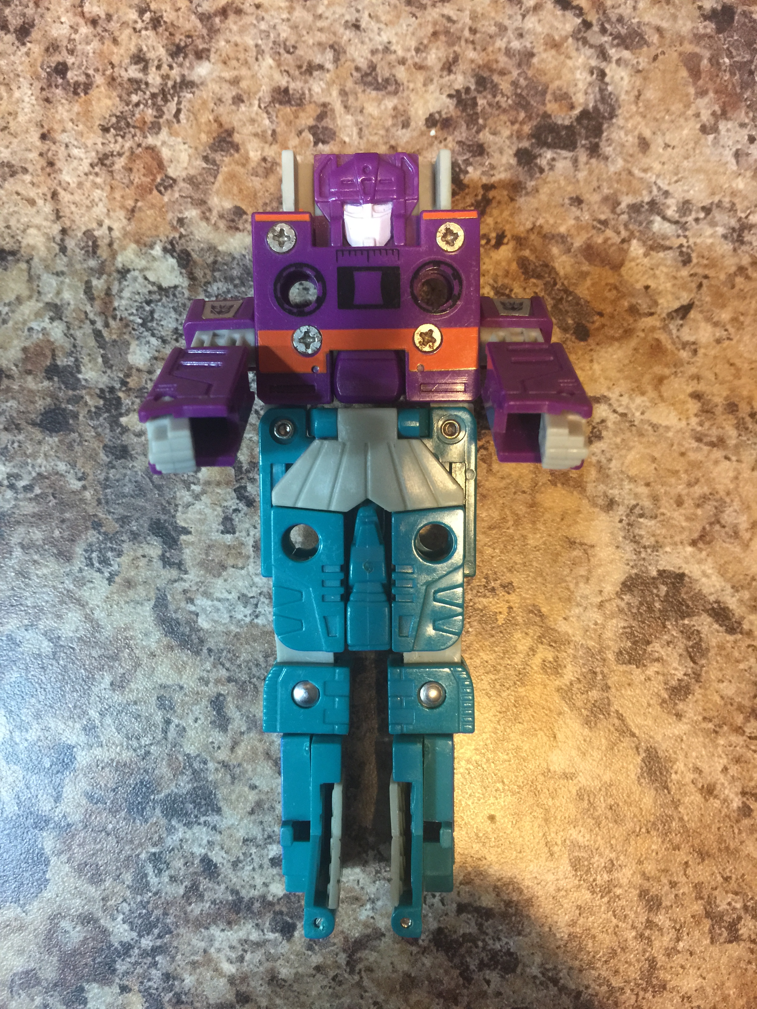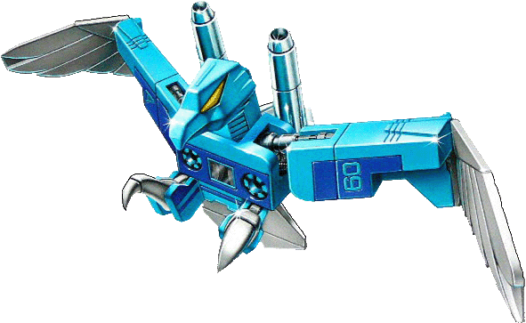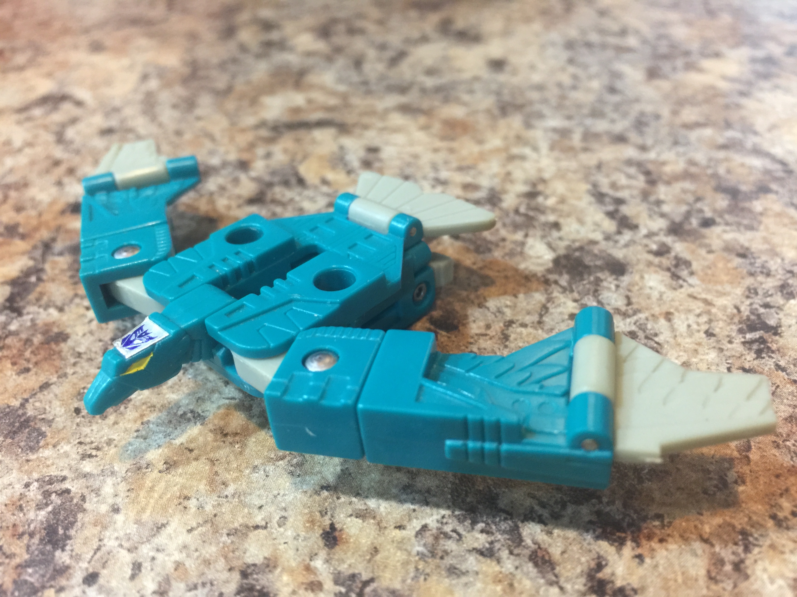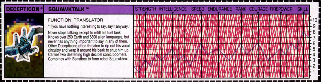 Never stops talking except to refill his fuel tank. Knows over 250 Earth and 6300 alien languages, but never has anything important to say in any of them. Other Decepticons often threaten to rip out his vocal circuitry and wrap it around his beak to shut him up. Carries two deafening high decibel sonic boomers. Combines with Beastbox to form robot Squawkbox.