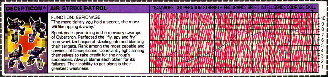 Profile: Spent years practicing in the mercury swamps of Cybertron. Perfected the "fly, spy, and fry" teamwork technique of stealing info and blasting their targets. Rank among the most capable and savviest of Decepticons. Constantly fight among themselves to take credit for the group's successes. Always blame each other for its failures. Their inability to get along is their greatest weakness.