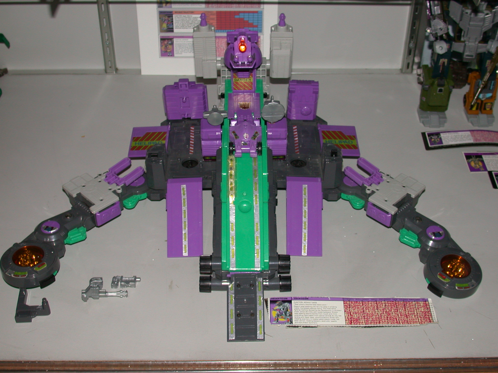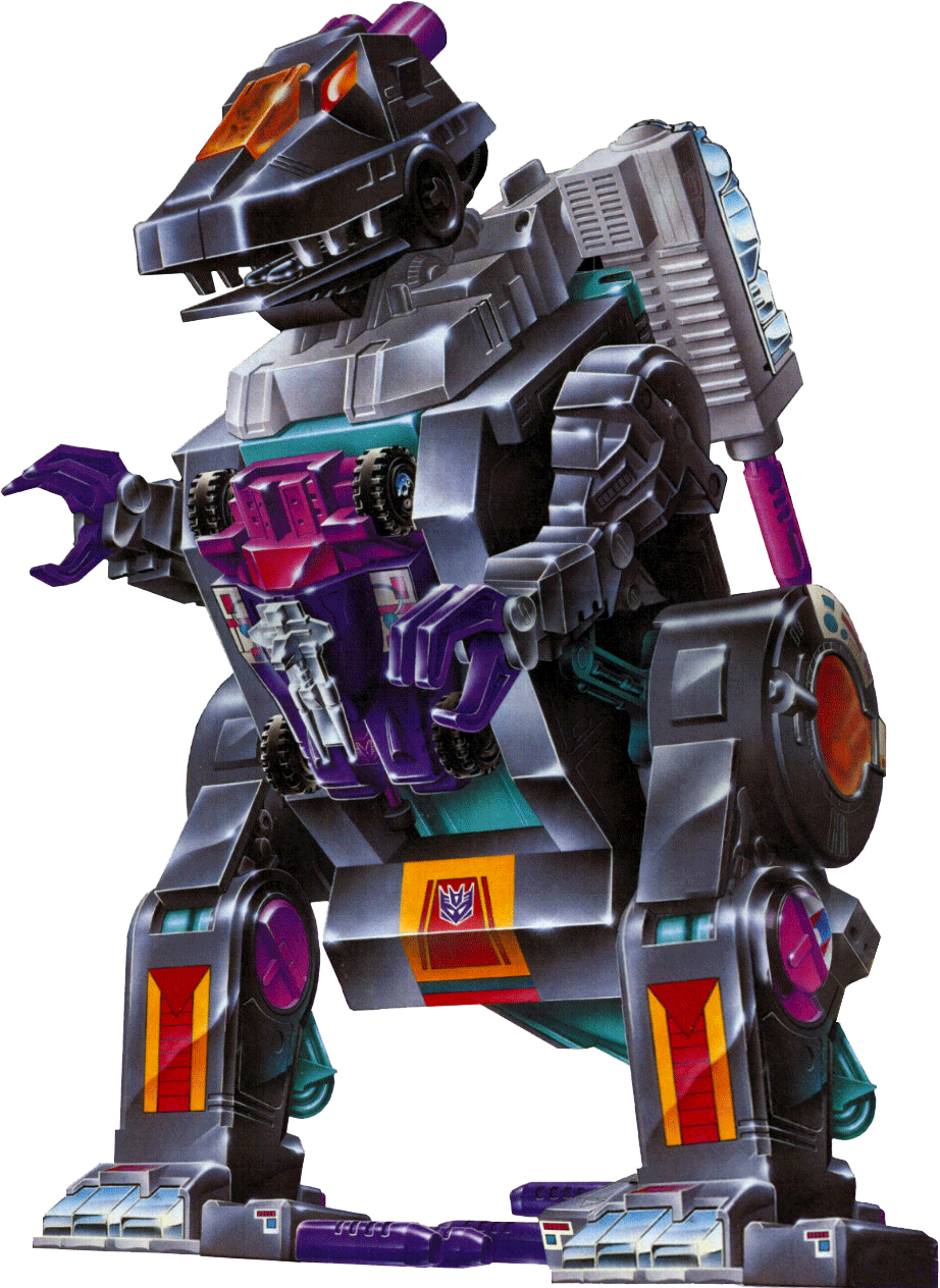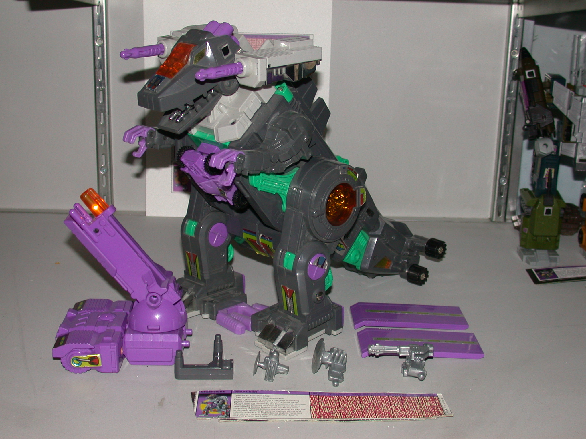 Doesn't stop blasting until he's hip-deep in smoking rubble. Completely without mercy. The most lethal fighting machine devised by the Decepticons. In dinosaur mode, jumps 20 miles with rocket backpack. Shoots heat-seeking plasma bombs from mouth and mind-controlling hypno-beam from optical sensor. As city, has landing and repair bays, communications center and rotating scanners. In mobile station mode, has laser cannon, rotating blasters, destructo-beams and dual photon launchers. | |||||||