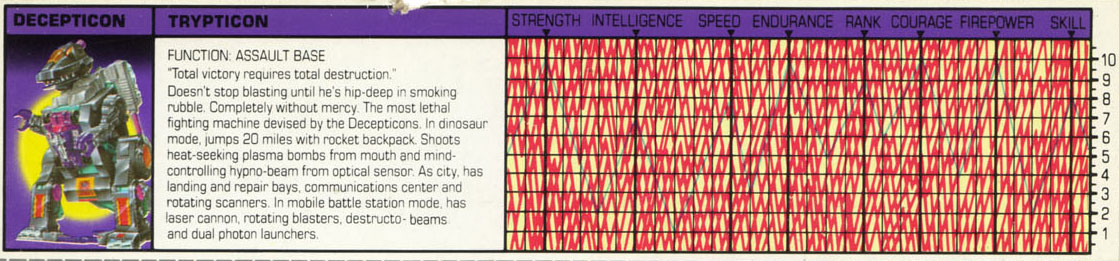 Profile: Trypticon doesn't stop blasting away until he's wading hip-deep in smoking rubble. He's the most efficient, lethal fighting machine yet devised by the Decepticons. He is completely without mercy or remorse. The only emotion that he is programmed to display is hatred. He hates everyone and everything. This feeling is always present; it only varies in intensity. He restrains his loathing for his fellow Decepticons enough to be minimally cooperative, but his hatred for Autobots knows no bounds. Humans do not inspire such strong feelings in him; he considers them barely worthy of his attention. But he also thinks they get in the way too much. Without blinking an optical module, he would level an entire city just to get a clear shot at an Autobot. He is supremely confident in his abilities, but unsure of the Decepticons' goals. Although he believes he will one day rule the Decepticons, he has so little use for anyone else that this prospect barely has any appeal to him. Trypticon makes no attempt to hide his feelings... except to himself. He can't admit to himself that his hatred for others is a mask for his own self-loathing. He'd rather be doing anything other than what he does. He secretly finds warfare boring and pointless. But he accepts the fact that fate has forced him into his role of the ultimate warrior... and nobody does it better!