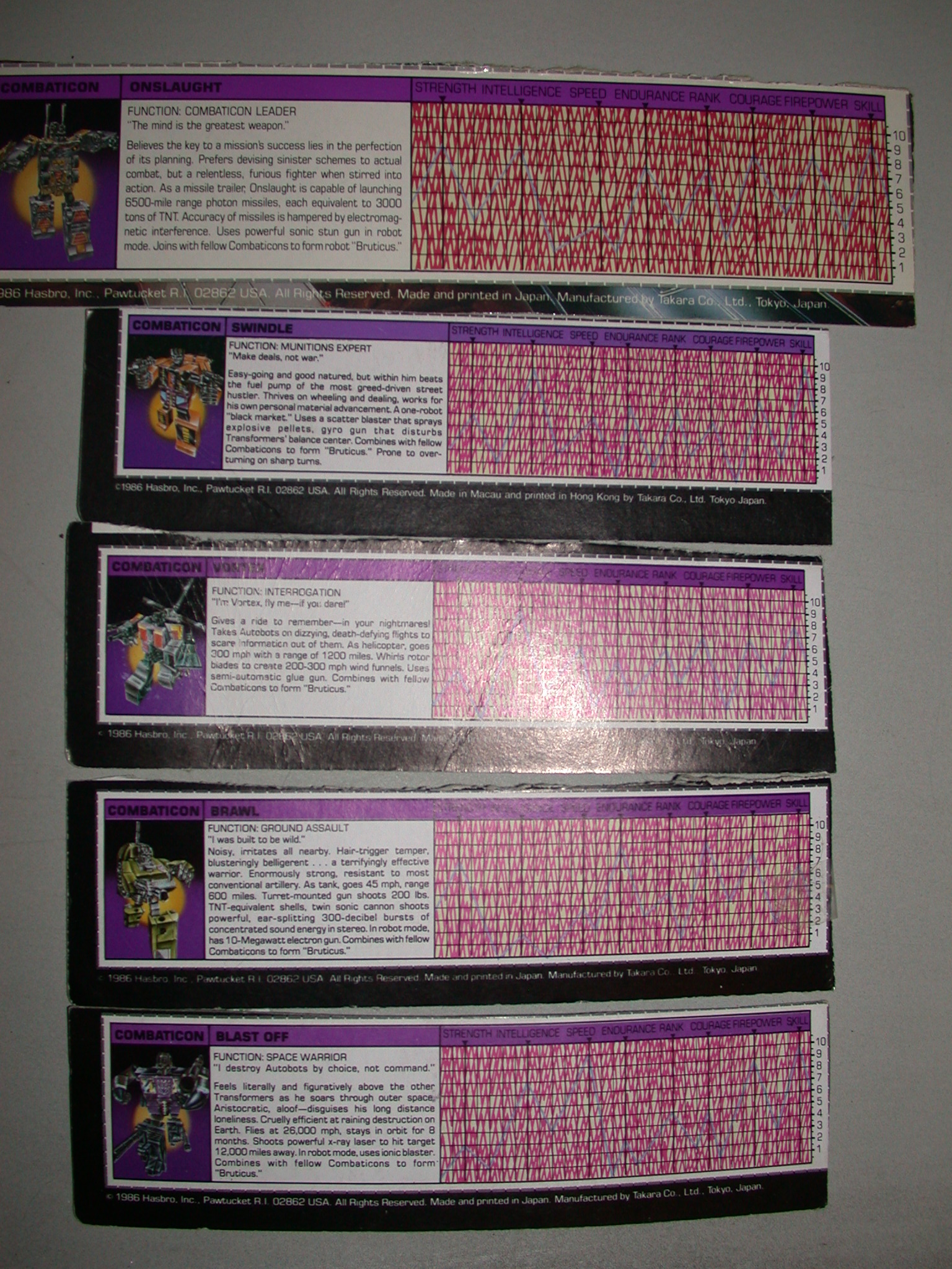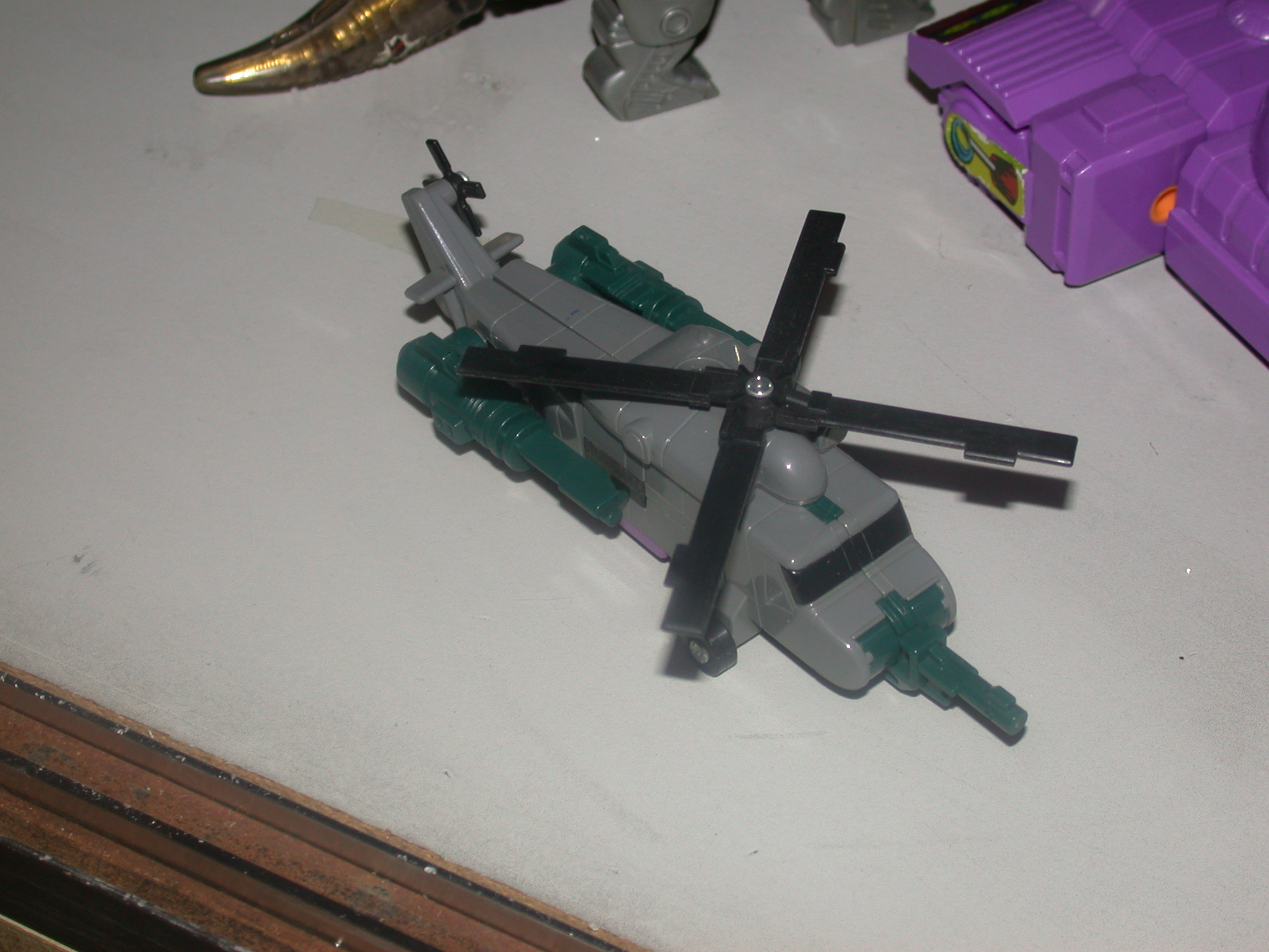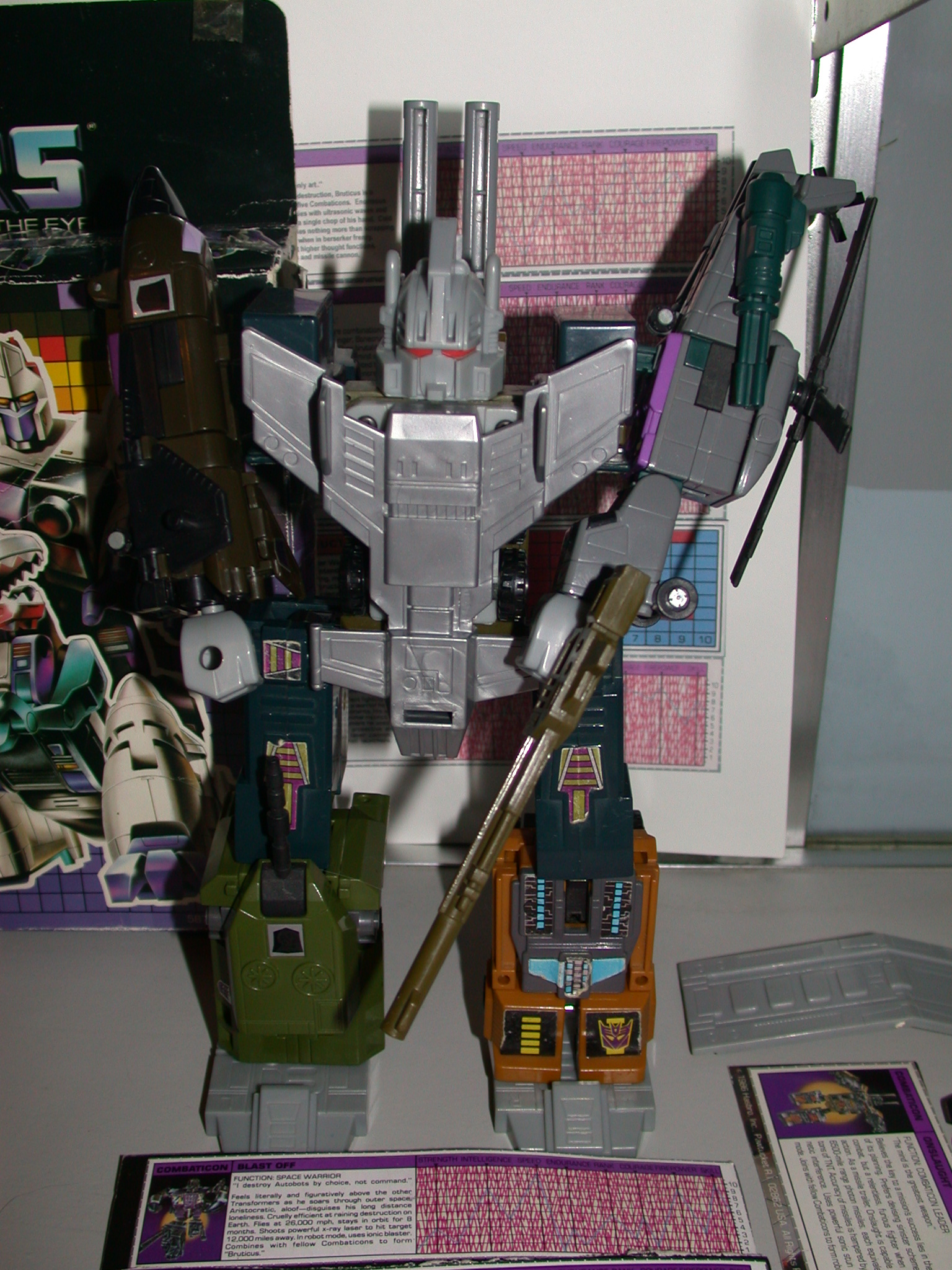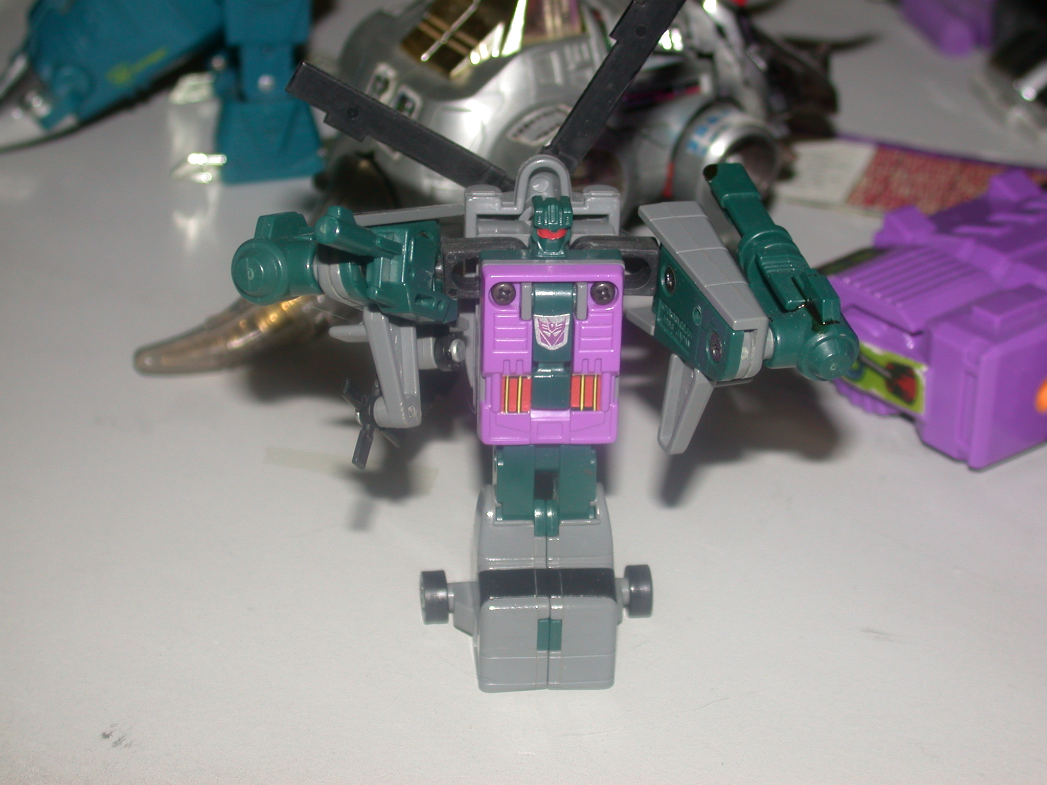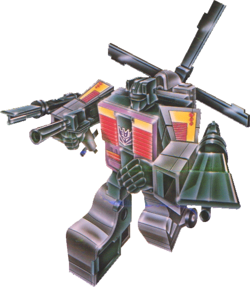 Gives a ride to remember -- in your nightmares! Takes Autobots on dizzying, death-defying flights to scare information out of them. As helicopter, goes 300mph with a range of 1200 miles. Whirls rotor blades to create 200-300 mph wind funnels. uses semi-automatic glue gun. Combines with fellow Combaticons to form "Bruticus".
