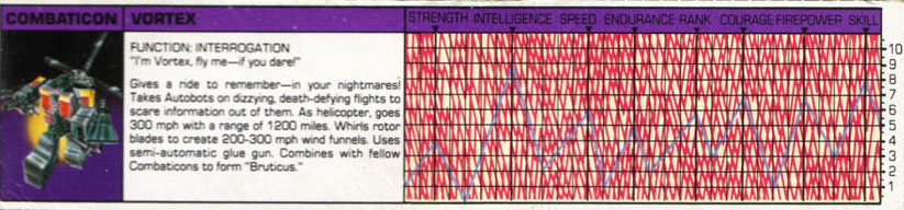Abilities: In helicopter mode, Vortex can attain a speed of 300 mph. His range is 1200 miles. He can whirl his rotor blades fast enough to create wind funnels that spin at speeds of 200-300 mph, powerful enough to lift a locomotive off its rails. He can suspend himself in the air in almost any position, which allows him to direct these funnels anywhere he wants. In robot mode, he uses a semi-automatic glue gun. It shoots capsules of highly adhesive liquid that will cement anything it hits to anything its target touches. Vortex combines with his fellow Combaticons to form the giant robot "Bruticus."