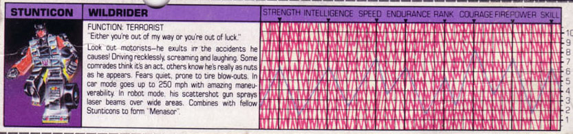 Profile: Look out, motorists! The road hasn't been built yet that's big enough to handle Wildrider! Some of his fellow Stunticons attribute his reckless behavior to be a calculated attempt by Wildrider to enhance the atmosphere of fear he tries to create in his role as a terrorist. But those who know him better realize it's not an act - he really is that nuts! As his fellow Stunticon Breakdown puts it, "When he's driving, I'd rather take a plane."