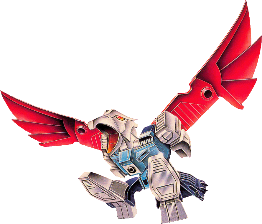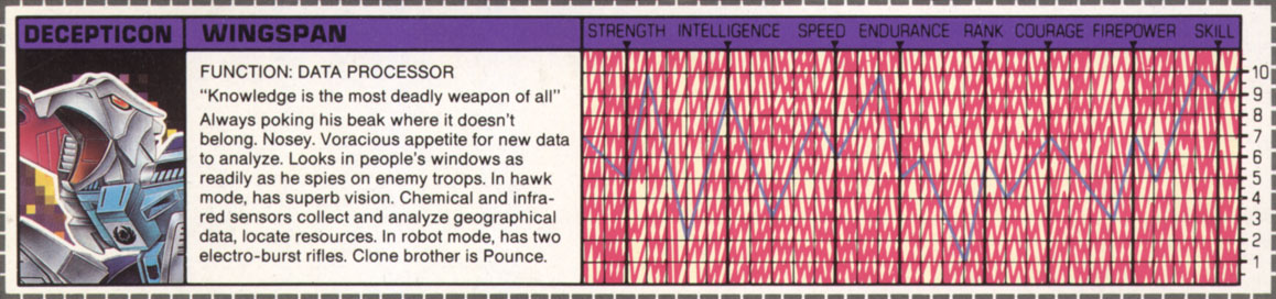 Always poking his beak where it doesn't belong. Nosey. Voracious appetite for new data to analyze. Looks in people's windows as readily as he spies on enemy troops. In hawk mode, has superb vision. Chemical and infra-red sensors collect and analyze geographical data, locate resources. In robot mode, has two electro-burst rifles. Clone brother is Pounce.