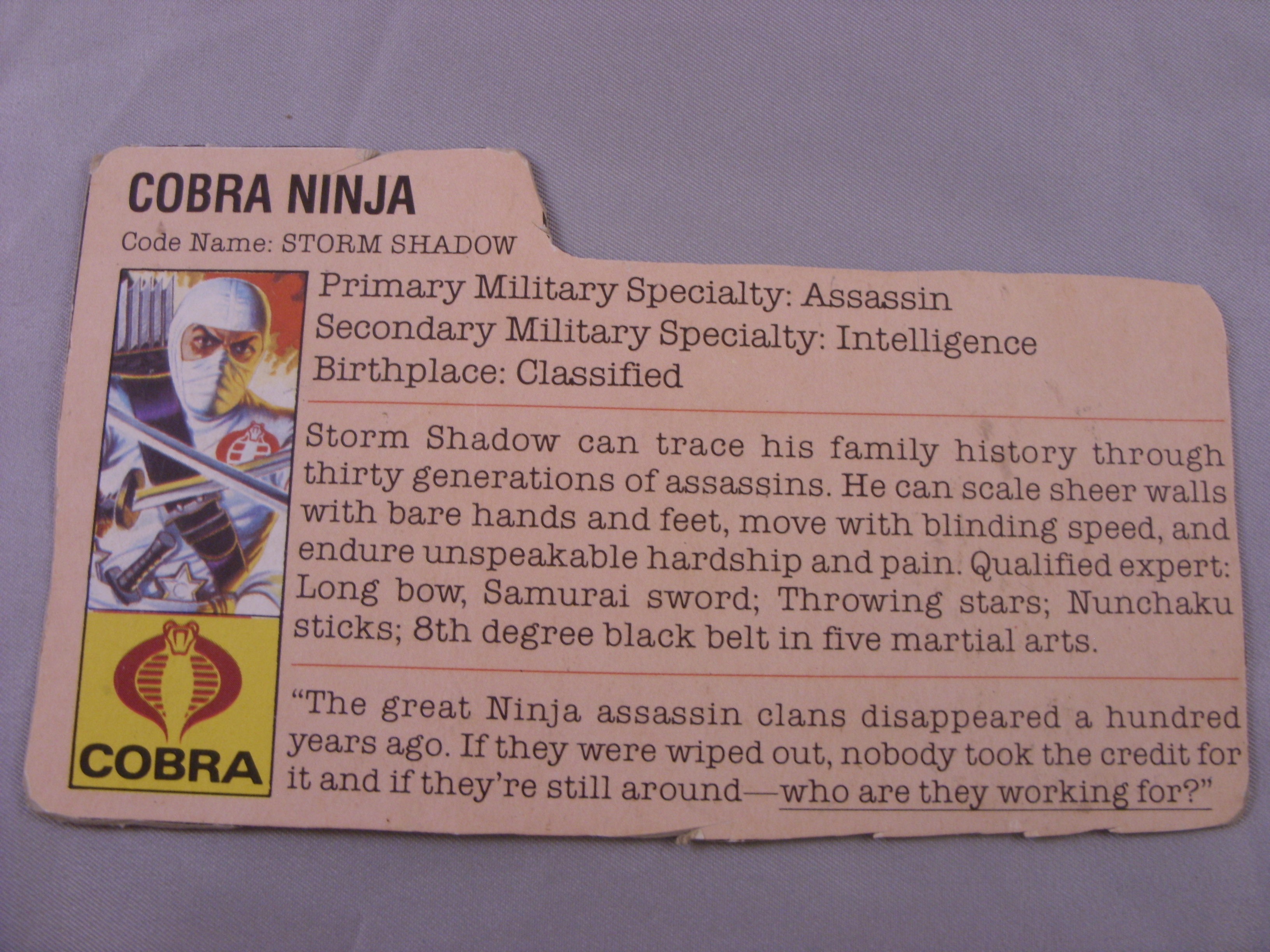 Code Name: STORM SHADOW Storm Shadow can trace his family history through thirty generations of assassins. He can scale sheer walls with bare hands and feet, move with blinding speed, and endure unspeakable hardship and pain. Qualified expert: Long bow, Samurai sword; Throwing stars; Nunchaku sticks; 8th degree black belt in five martial arts. "The great Ninja assassin clans disappeared a hundred years ago. If they were wiped out, nobody took the credit for it and if they're still around--who are they working for?"