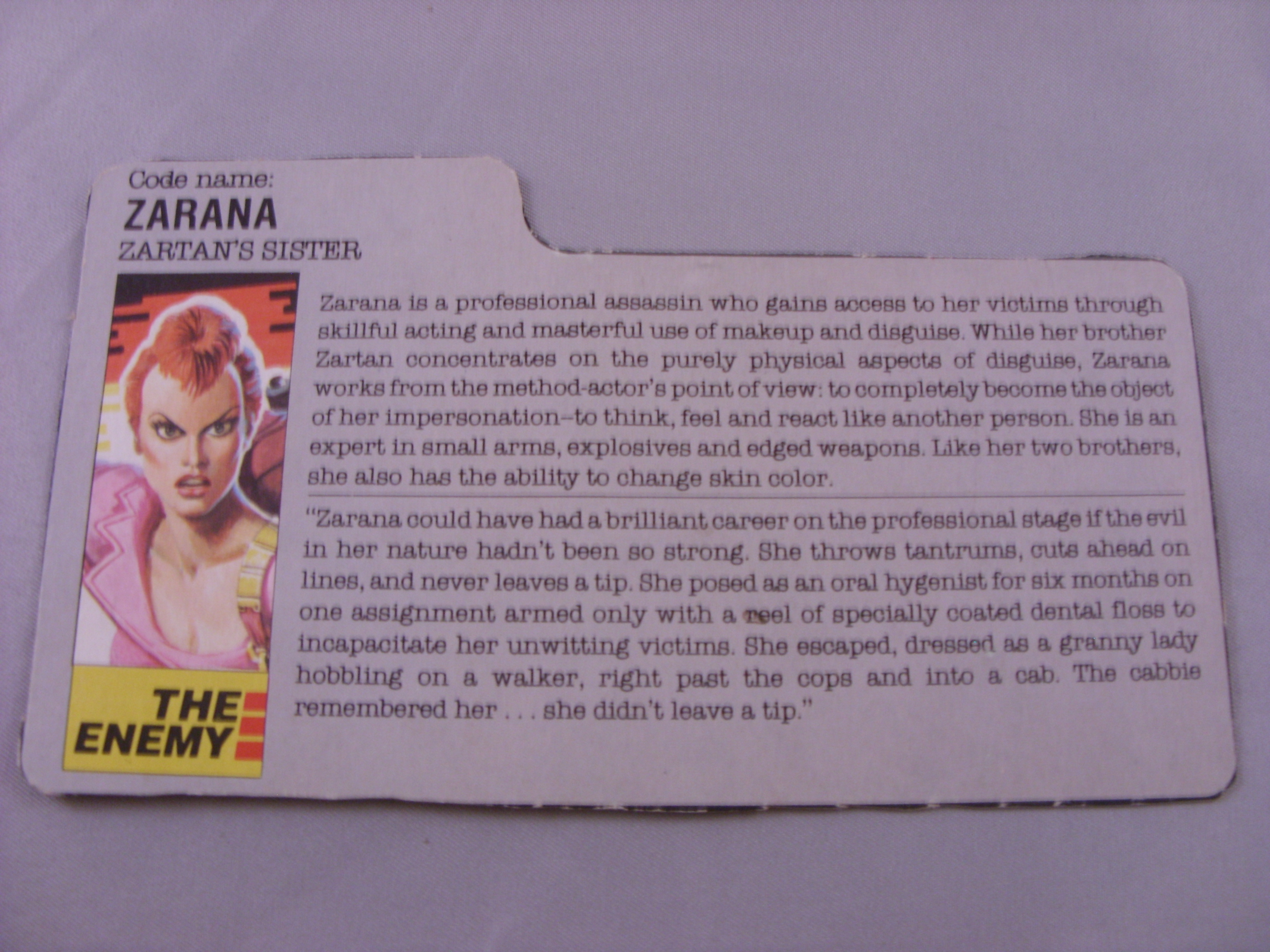 Code Name: ZARANA Zarana is a professional assassin who gains access to her victims through skillful acting and masterful use of makeup and disguise. While her brother Zartan concentrates on the purely physical aspects of disguise, Zarana works from the method-actor's point of view; to completely become the object of her impersonation- to think, feel and react like another person. She is an expert in small arms, explosives and edged weapons. Like her two brothers, she also has the ability to change skin color. "Zarana could have had a brilliant career on the professional stage id the evil in her nature hadn't been so strong. She throws tantrums, cuts ahead on lines, and never leaves a tip. She posed as an oral hygienist for six months on one assignment armed only with a reel of specially coated dental floss to incapacitate her unwitting victims. She escaped, dressed as a granny lady hobbling on a walker, right past the cops and into a cab. The cabbie remembered her... she didn't leave a tip." |