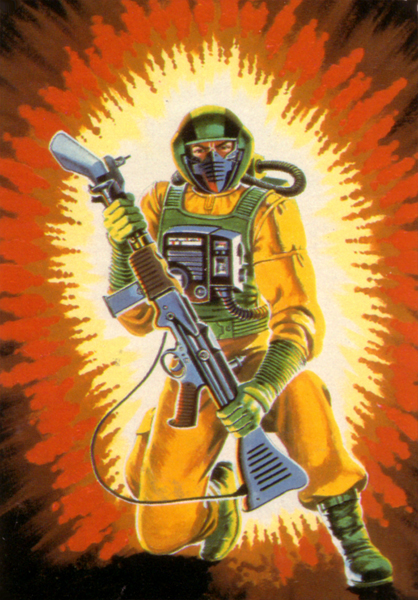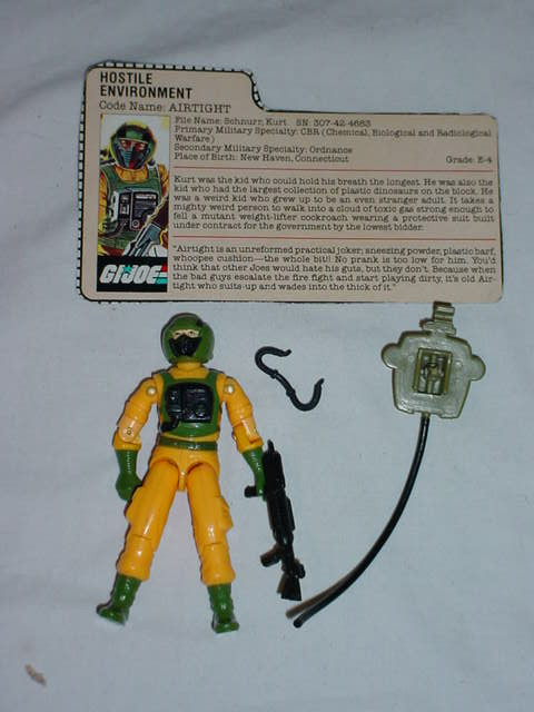 Code Name: AIRTIGHT Kurt was the kid who could hold his breath the longest. He was also the kid who had the largest collection of plastic dinosaurs on the block. He was a weird kid who grew up to be an even stranger adult. It takes a might weird person to walk into a cloud of toxic gas strong enough to fell a mutant weight-lifter cockroach wearing a protective suit built under contract for the government by the lowest bidder. "Airtight is an unreformed practical joker; sneezing powder, plastic barf, whoopee cushion-- the whole bit!! No prank is too low for him. You'd think that other Joes would hate his guts, but they don't. Because when the bad guys escalate the fire fight and start playing dirty, it's old Airtight who suits-up and wades into the thick of it."