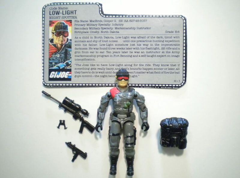 Code Name: LOW-LIGHT As a child in North Dakota, Low-Light was afraid of the dark, timid with animals and shy of loud noises... until one precarious hunting expedition with his father. Low-Light somehow lost his way in the impenetrable darkness. He was found three weeks later with his flashlight, .22 rifle and a grin from ear to ear. Ten years later he was an instructor at the Army marksmanship program in Fort Benning and a self-taught expert on image intensification. "The Joes like to have Low-Light along for the ride. They know that if something gets really hairy, and that's bound to happen sooner or later, all they have to do is wait until dark... it doesn't matter what field of fire the bad guys control-- the night belongs to Low-Light."